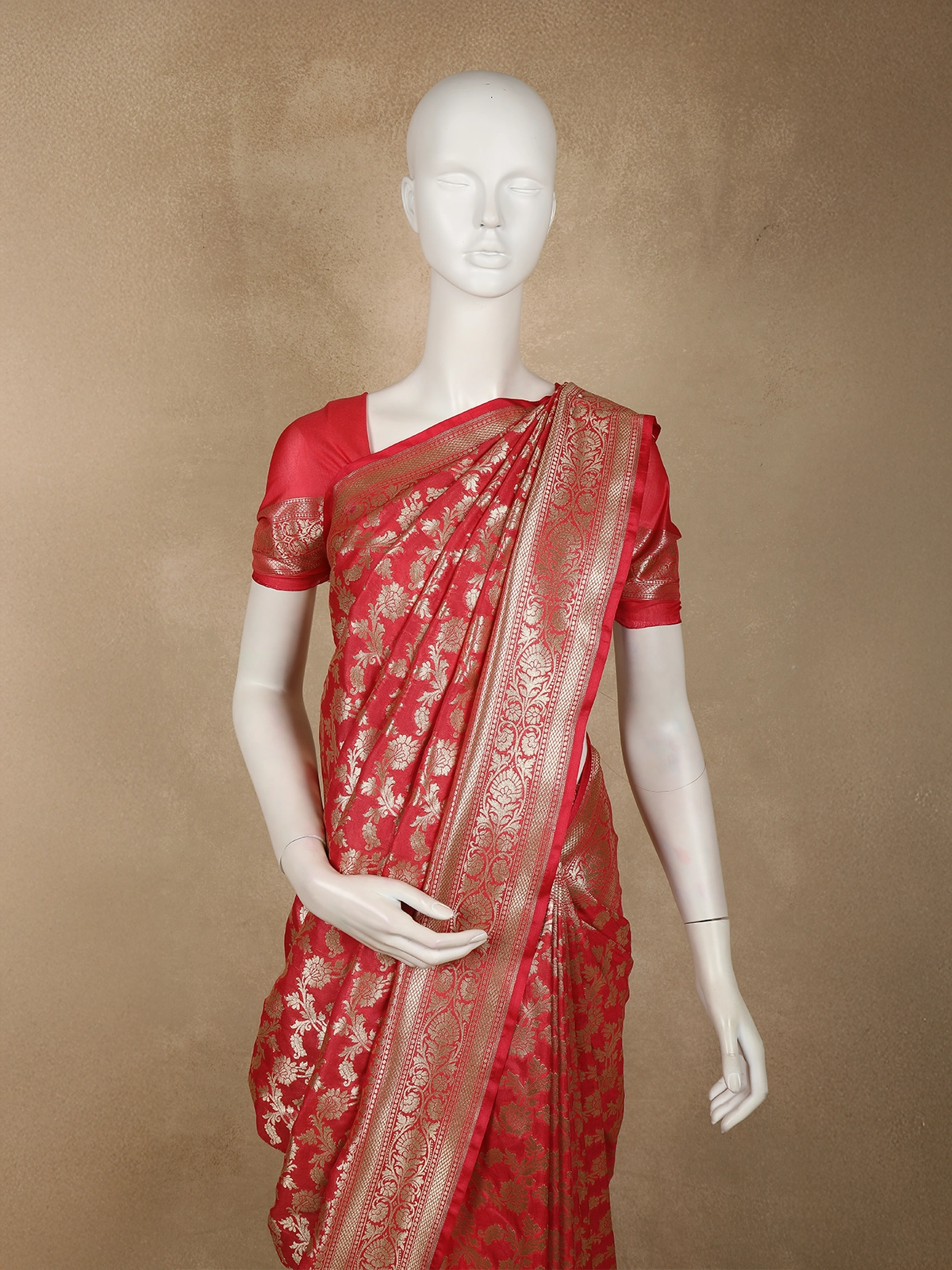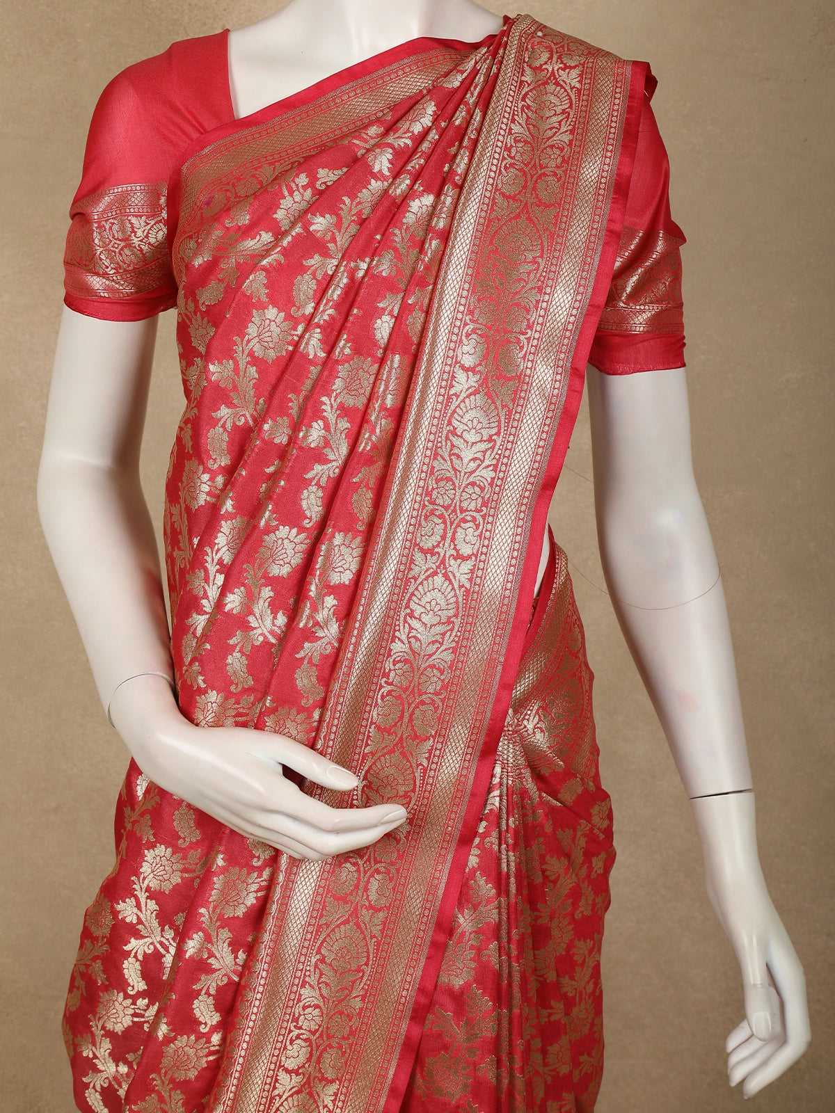 The saree is completed with a matching red blouse and pallu, maintaining a harmonious tone that exudes sophistication. The intricately woven zari border adds a touch of grandeur, lending the drape a royal edge that’s perfect for weddings, festive celebrations, and traditional occasions.