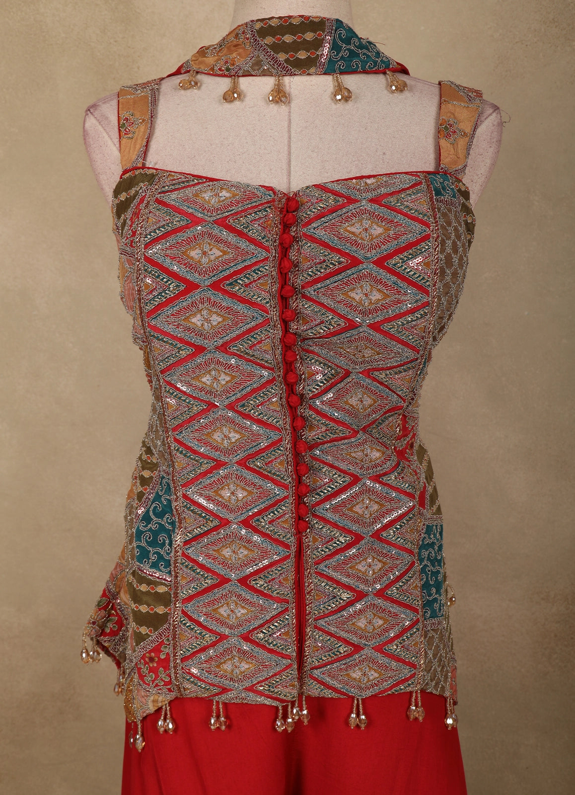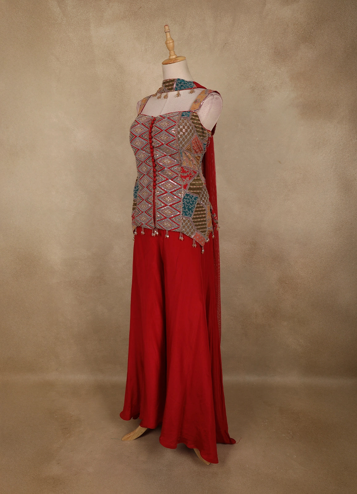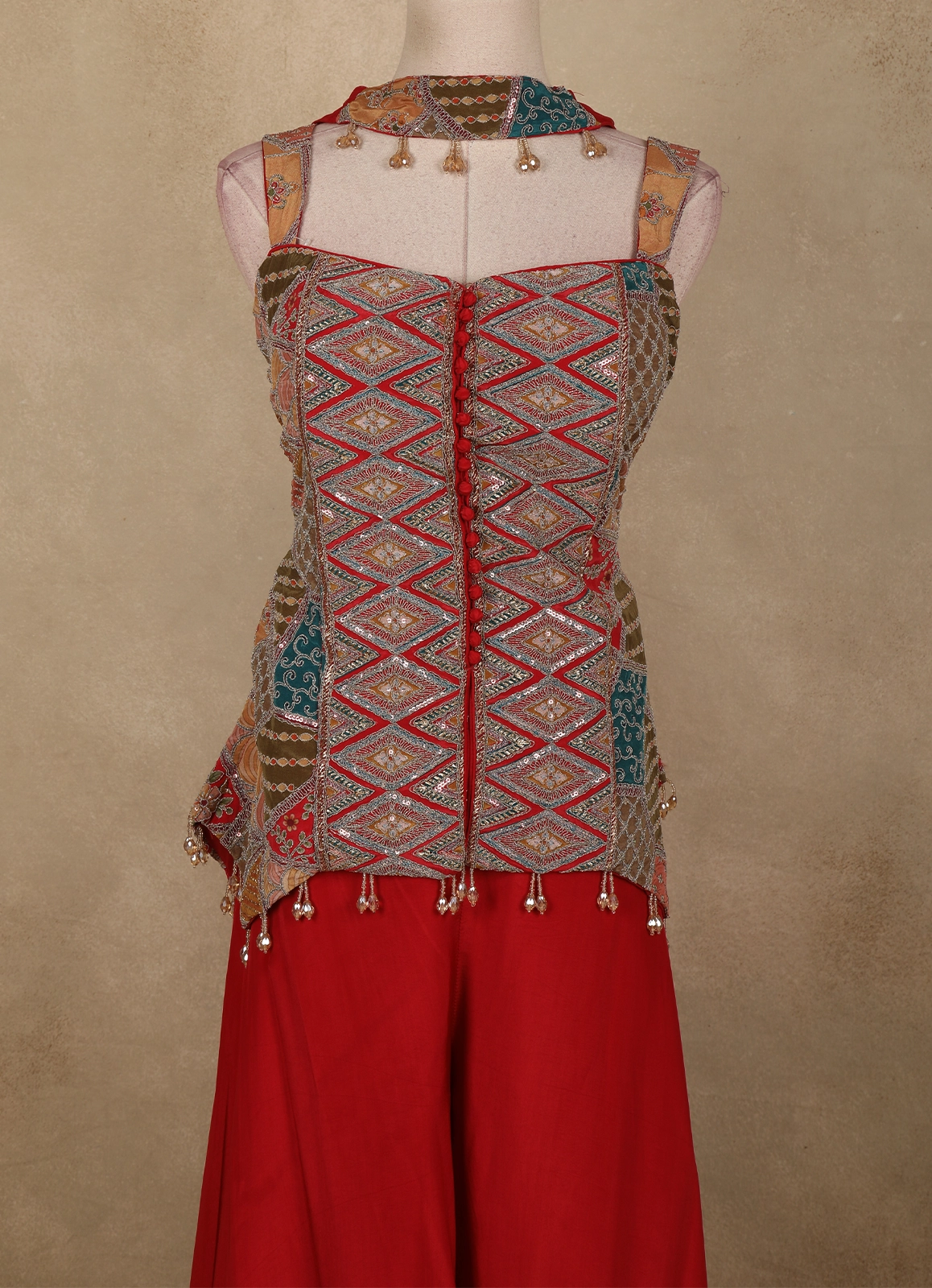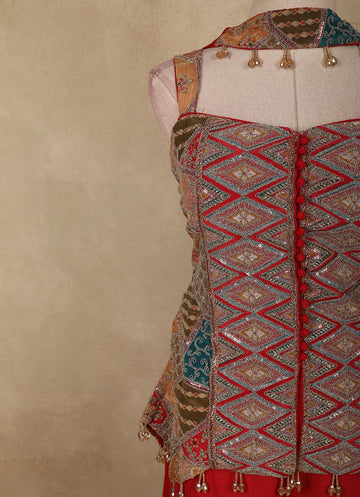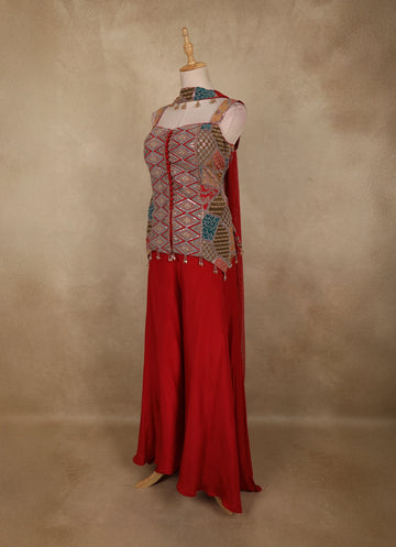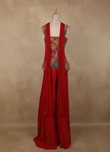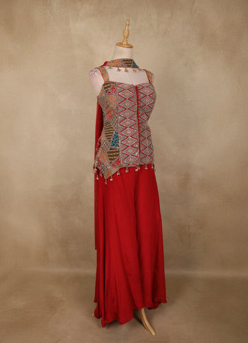 Make a bold style statement with this Red Geometric Embroidered Design Crepe Palazzo Suit with Dupatta, a perfect fusion of contemporary charm and ethnic elegance. The sleeveless kurta-style top is beautifully enhanced with intricate geometric embroidery in multicolour tones, highlighted with fine thread work and subtle embellishments that add depth and visual interest. The structured silhouette and detailed front panel lend a modern, festive appeal.