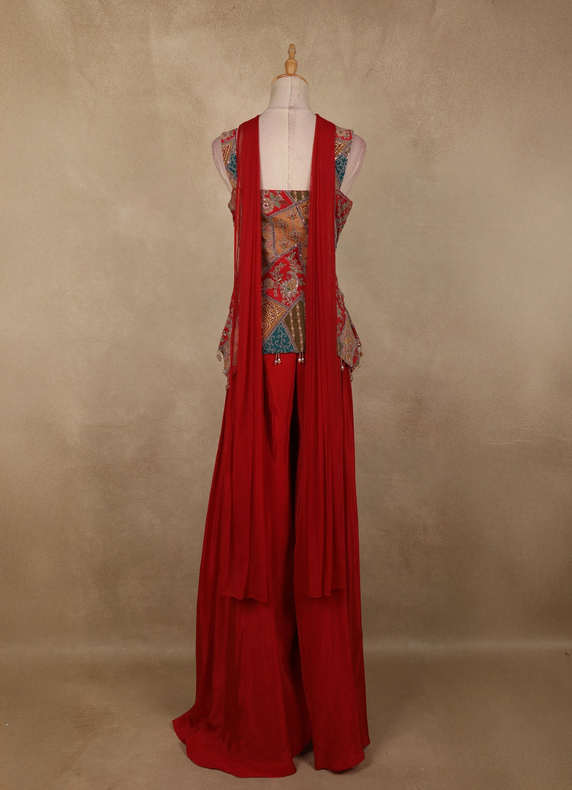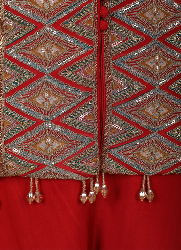 Crafted in soft crepe fabric, the palazzo pants offer a graceful flow and all-day comfort, complementing the vibrant red hue with effortless elegance. The coordinated dupatta completes the ensemble, adding a refined finishing touch that enhances the overall look.