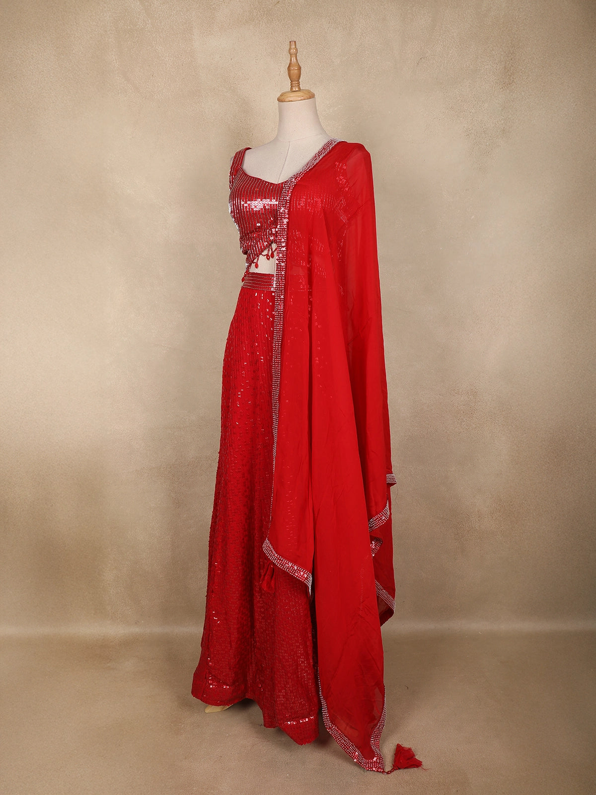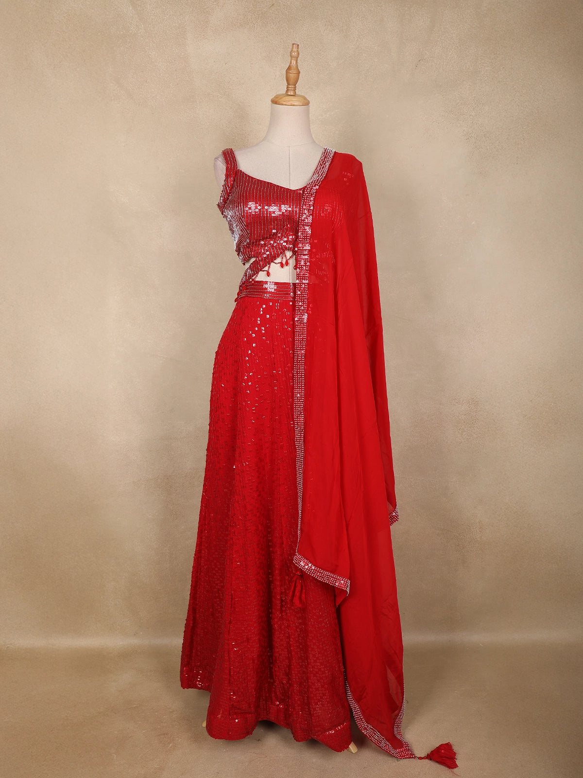 A matching georgette dupatta with a sequined border completes the ensemble, lending a soft balance while keeping the focus on the stunning craftsmanship. Tassel accents at the edge add a playful festive touch.