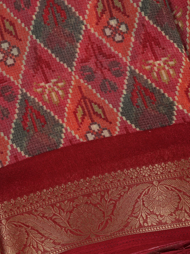 Red Multicolor Diamond Ikat Design Linen Cotton Saree