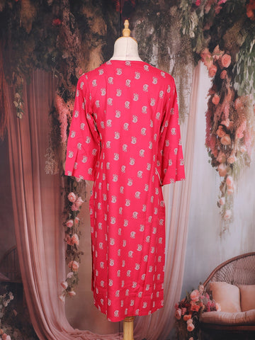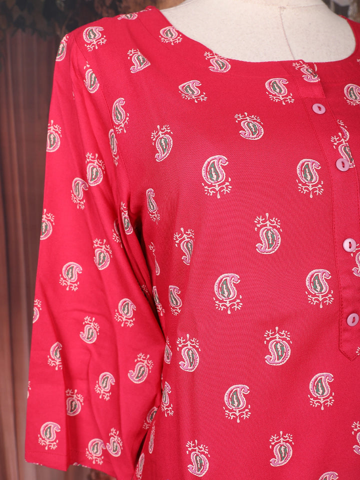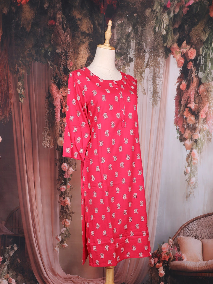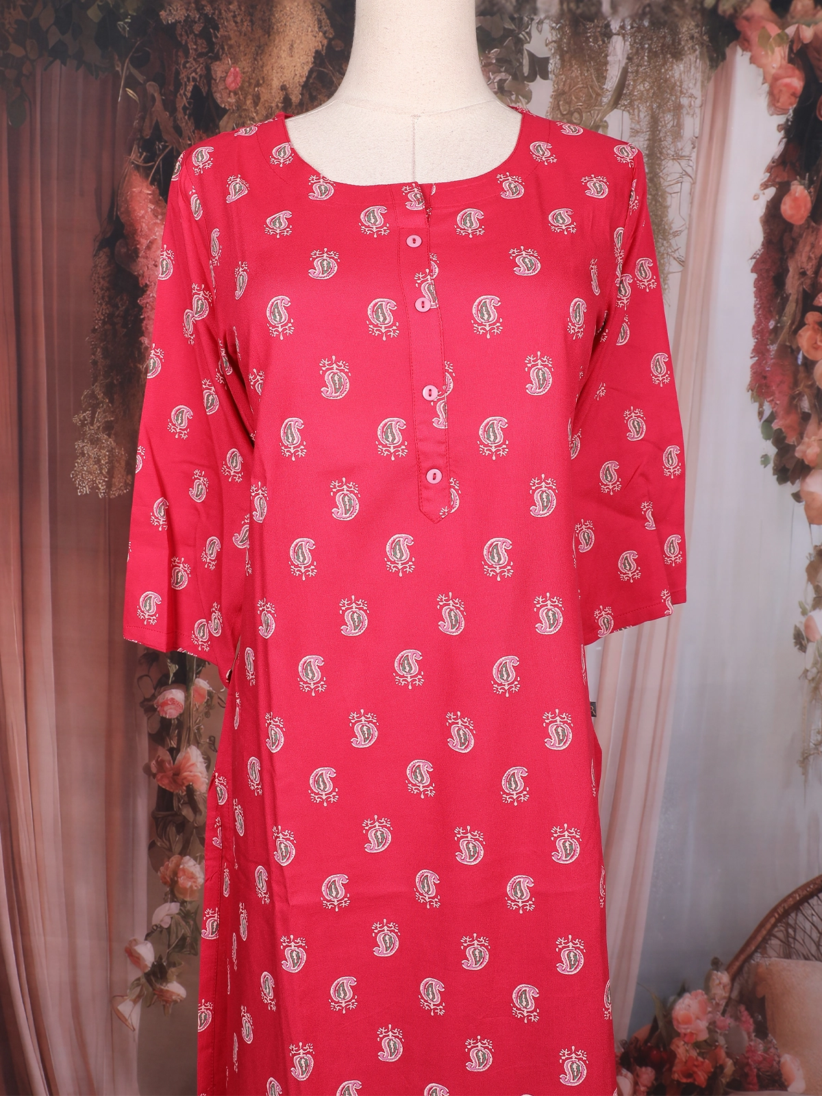 Brighten your everyday wardrobe with this Red Paisley Printed Cotton Rayon Kurti, a perfect fusion of tradition and comfort. Crafted from a soft and breathable cotton-rayon blend, this kurti features timeless paisley motifs in a vibrant red hue that adds a touch of cultural elegance. The classic U-neckline and practical 3/4 sleeves offer a flattering and easy-to-wear silhouette, making it suitable for daily wear, casual outings, or office attire.