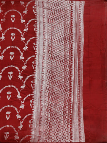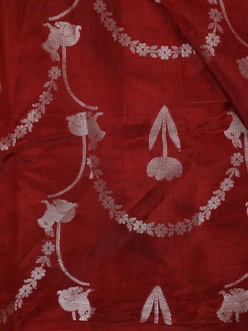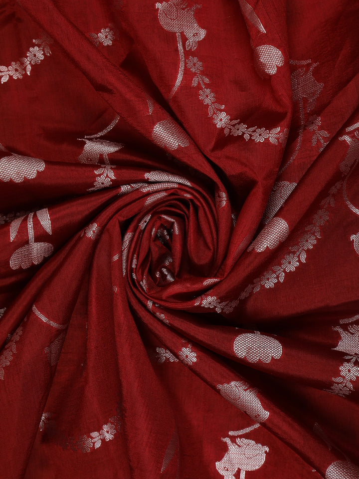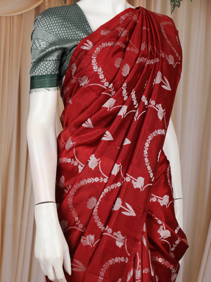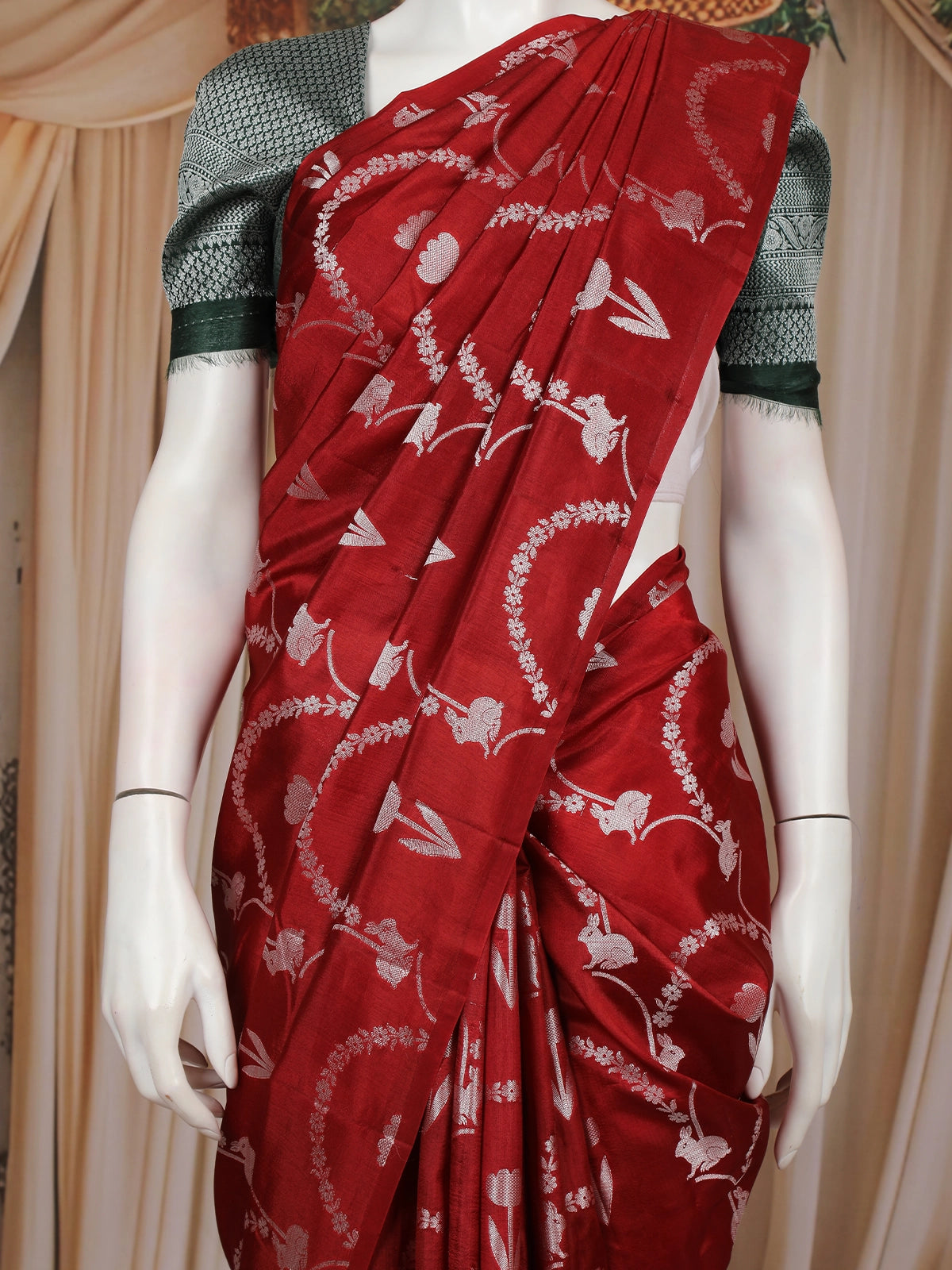 Celebrate your festive spirit with this captivating Red Semi Banarasi Silk Saree, beautifully adorned with an artistic blend of rabbit and floral motifs intricately zari woven across the body. The shimmering patterns bring together tradition and creativity, making this drape truly one of a kind.