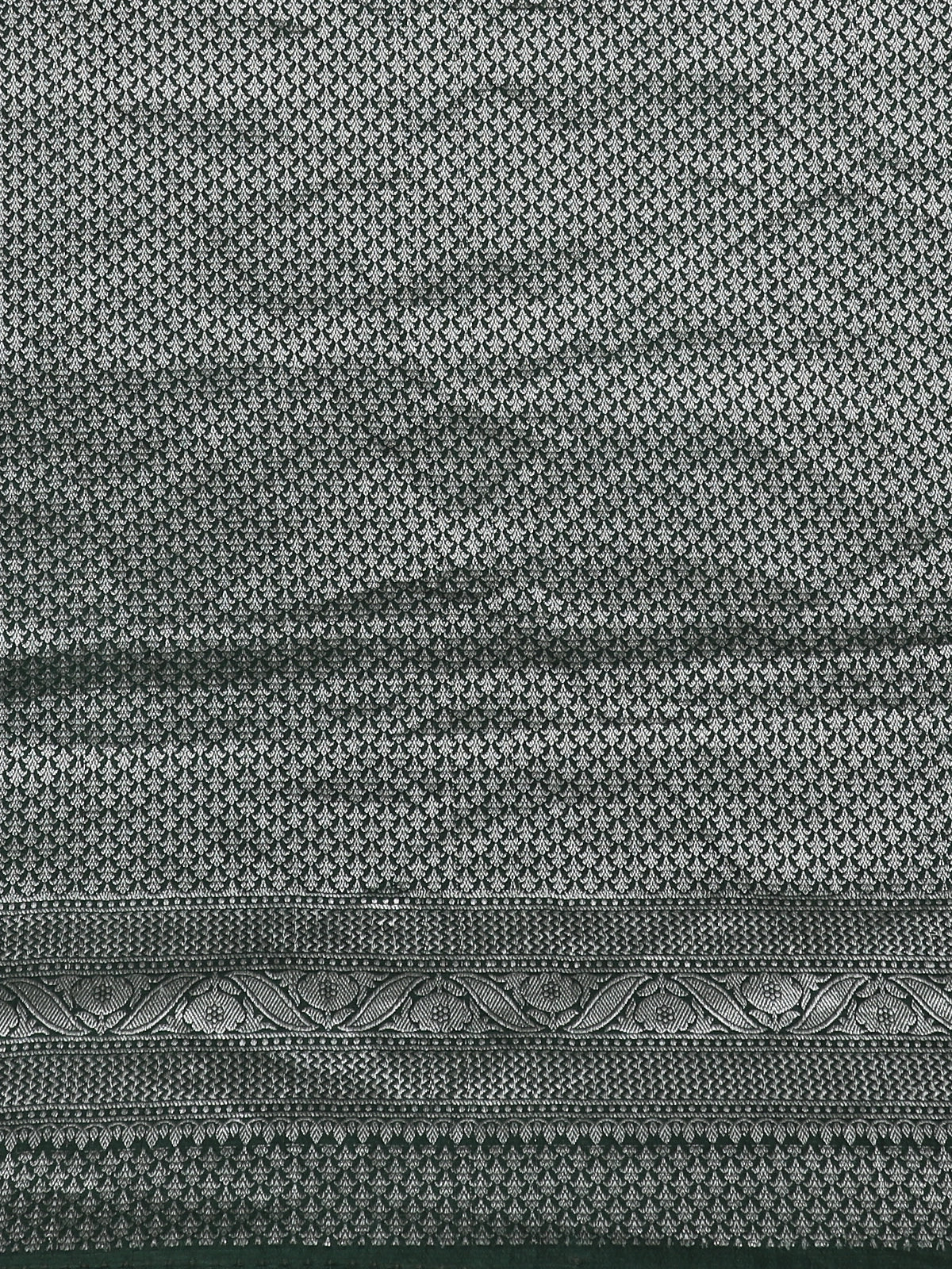 Crafted from lustrous semi Banarasi silk, the saree offers a soft, graceful fall and a rich sheen—ideal for festive gatherings, poojas, and traditional occasions. The matching red pallu and zari border enhance its royal aesthetic, while the contrast grey blouse adds a refined, contemporary balance to the vibrant base.
