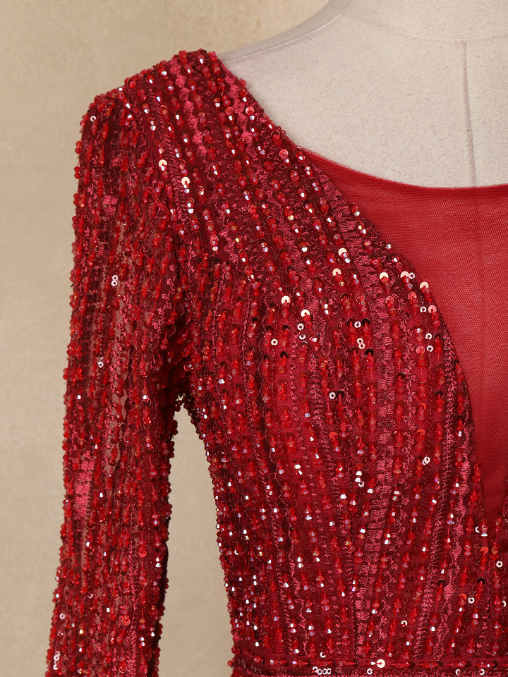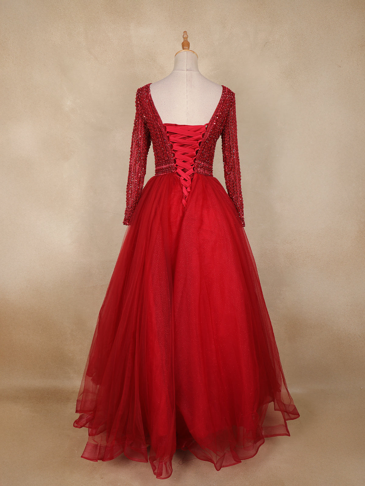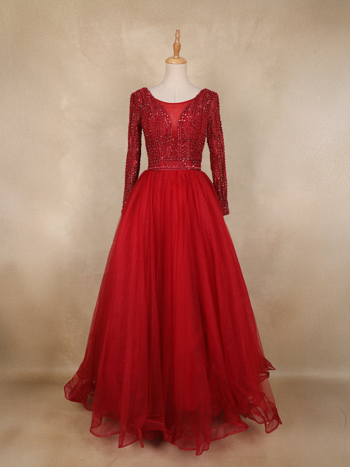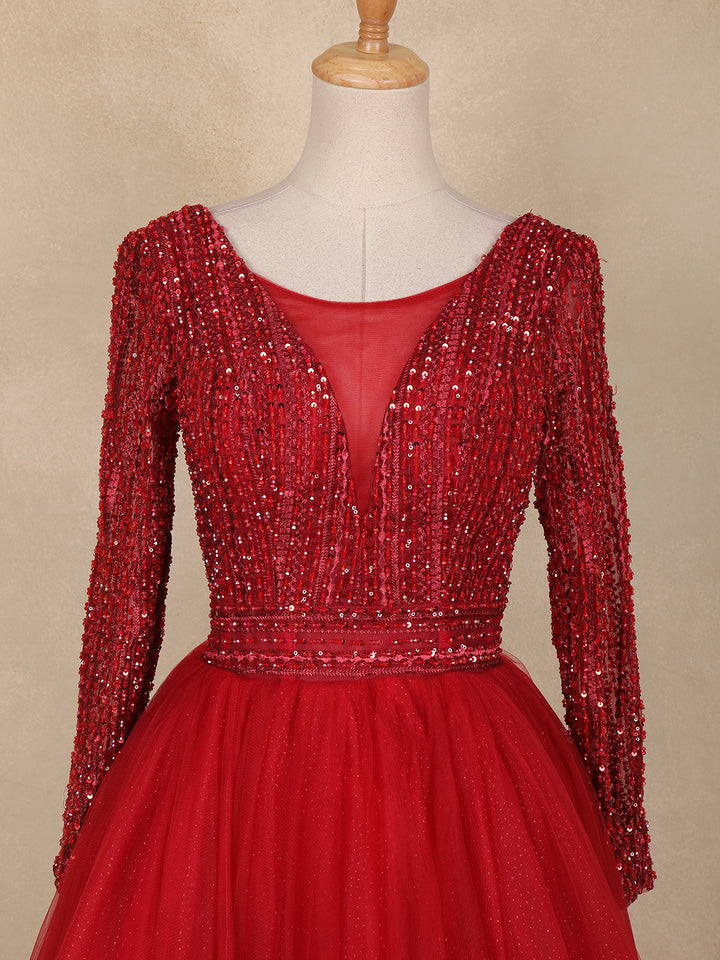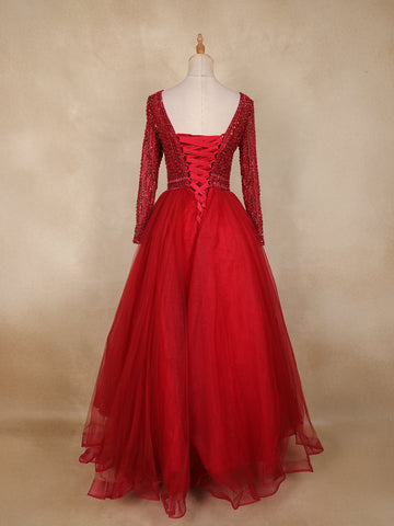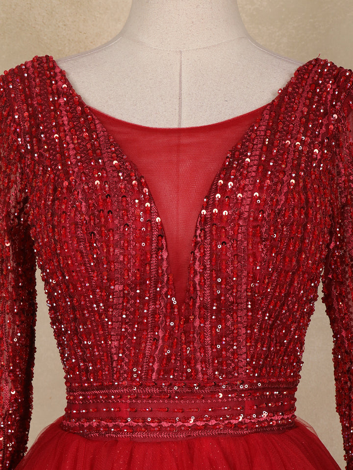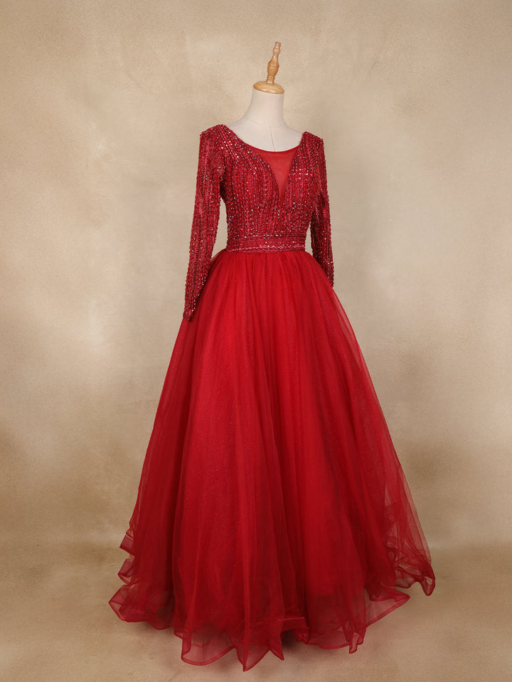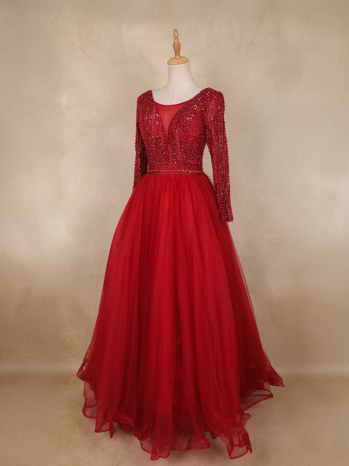 Red Sequins Embellished Design Net Ball Gown with Full Sleeves