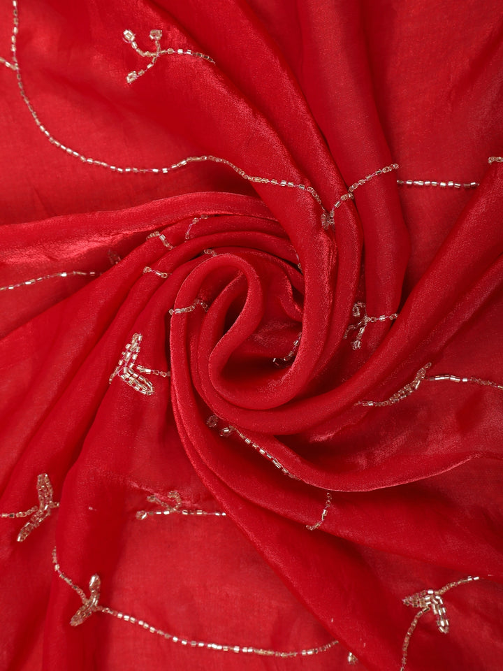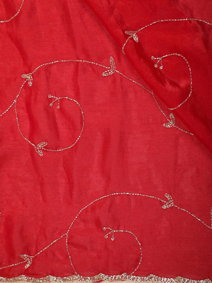 Step into effortless elegance with this stunning Red Sequins Embroidered Tissue Organza Saree, crafted to add a radiant charm to your festive wardrobe. The soft tissue fabric offers a graceful drape with a subtle sheen, creating a luxurious appeal with every movement.