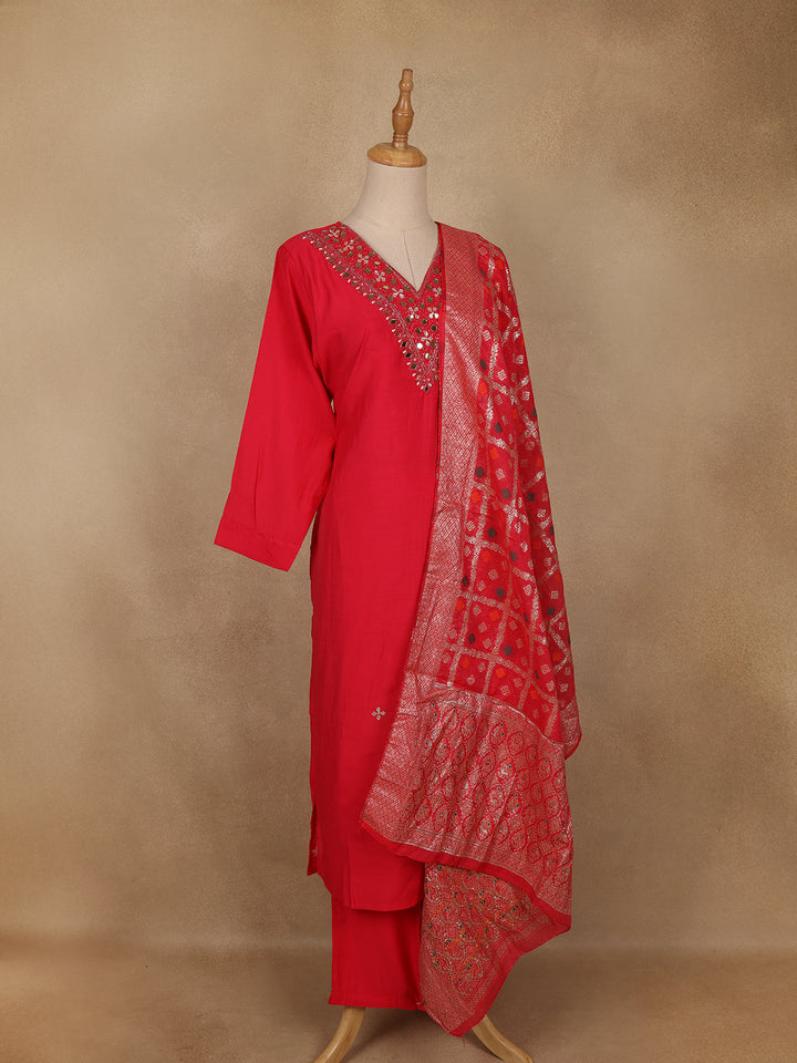 Red Solid Design Mirror Work Embroidered Salwar Suit
