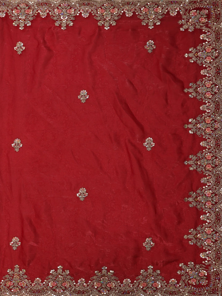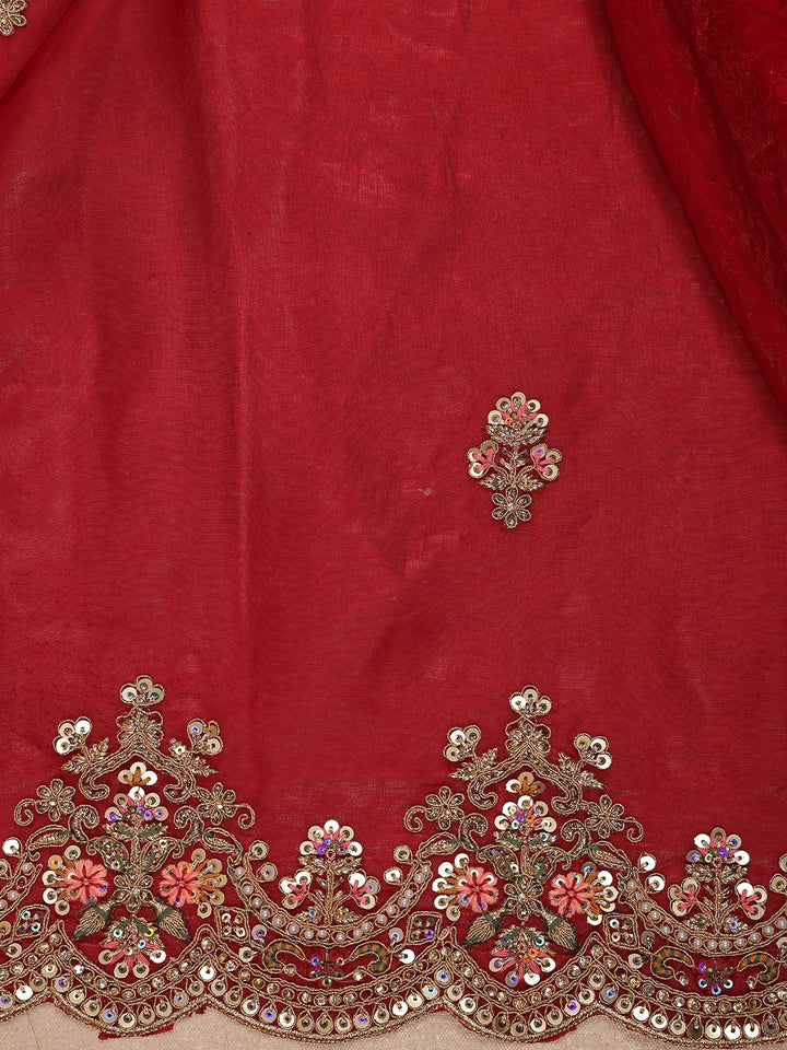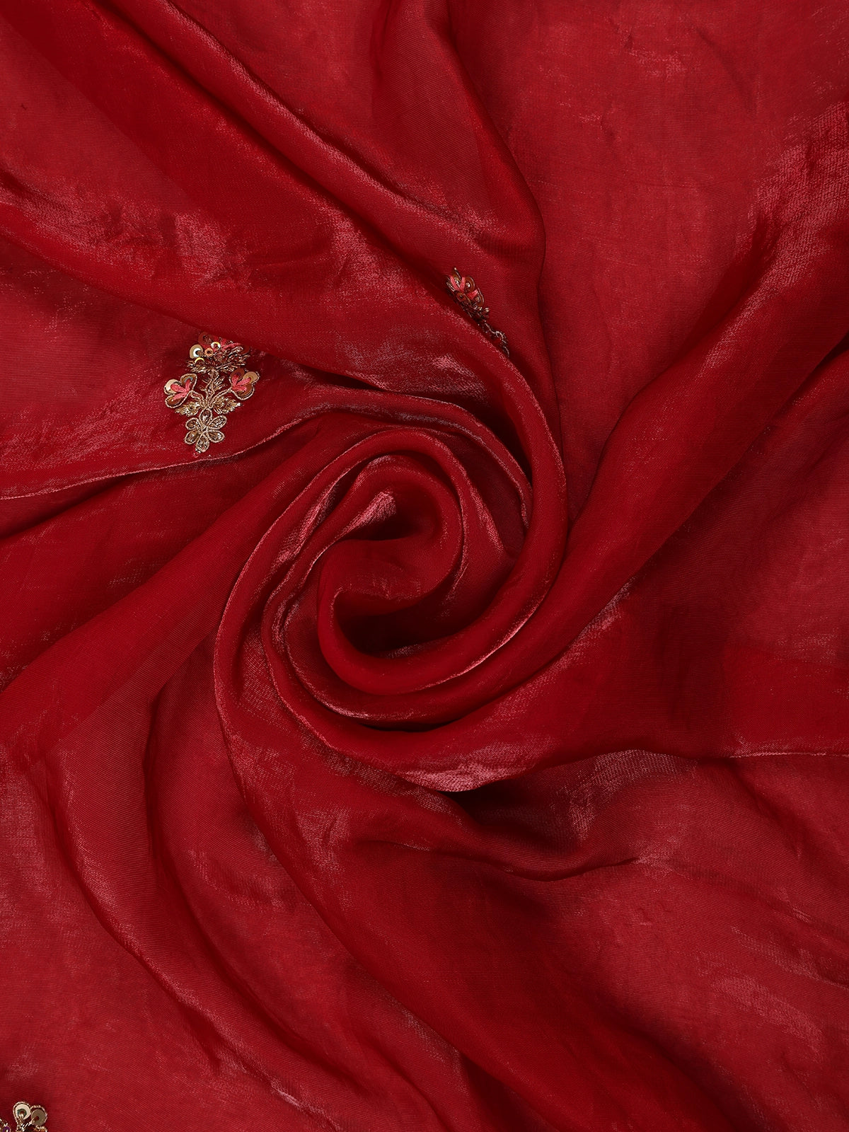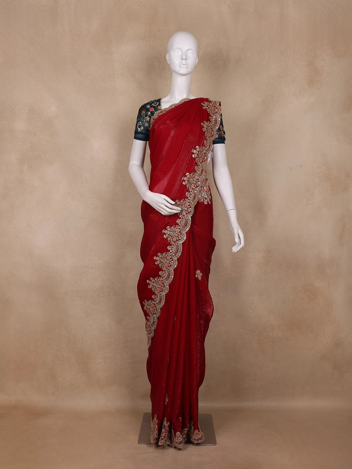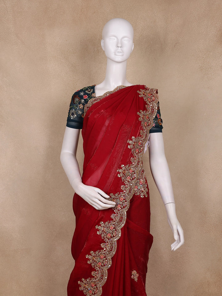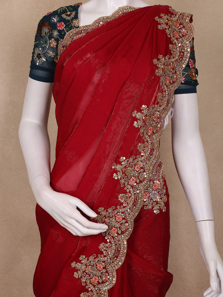 Embrace effortless elegance with this Red Solid Design Tissue Organza Saree, a timeless piece that radiates festive charm. The saree showcases a shimmering tissue organza drape, accentuated by a beautifully embroidered floral border highlighted with sequins and zari for a subtle yet striking effect.