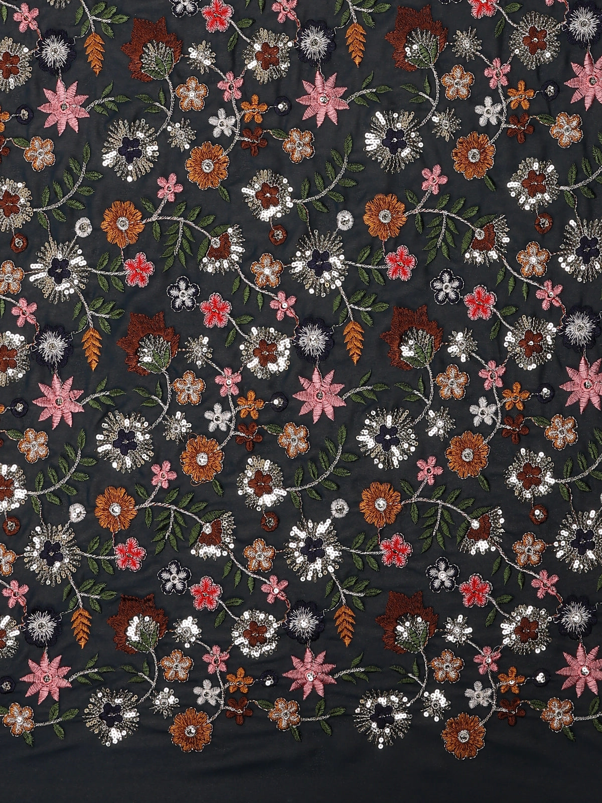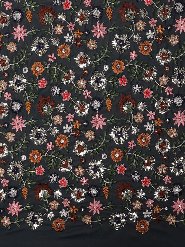 Complementing the saree is a navy blue floral embroidered blouse, intricately designed with multicolored threadwork, beads, and sequins that add a regal contrast to the red base. Lightweight yet grand, this ensemble blends modern sophistication with traditional grace, making it perfect for wedding festivities, receptions, and celebrations.