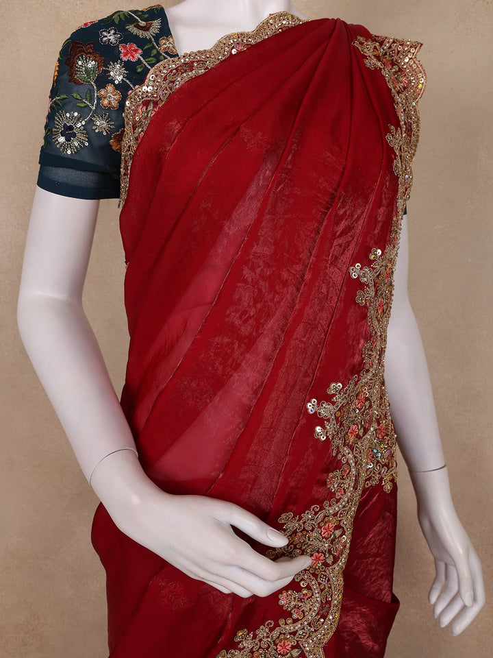 Red Solid Design Tissue Organza Saree With Navy Blue Floral Blouse
