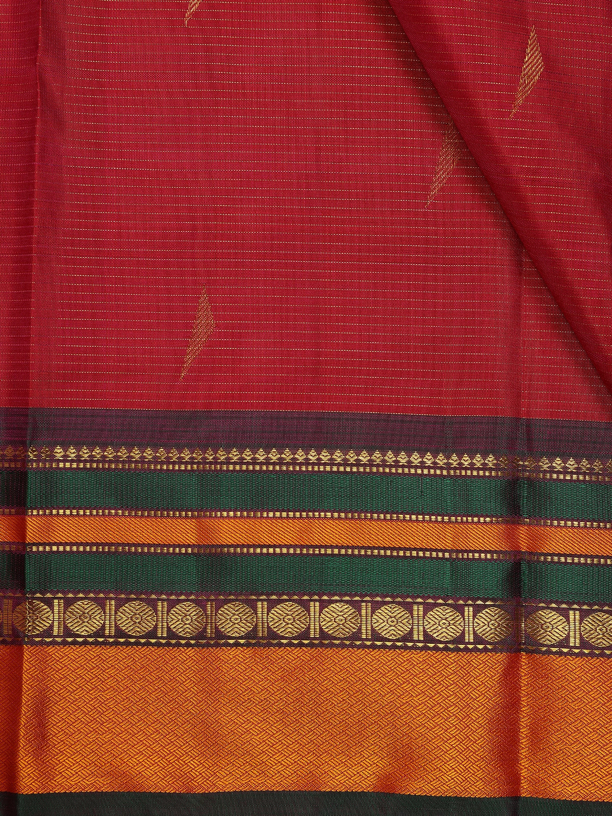 Step into timeless elegance with this Red Stripes Woven Kanchipuram Silk Saree, a classic drape that celebrates South Indian grandeur. The luxurious red body is adorned with refined woven stripes that add a touch of understated sophistication.
