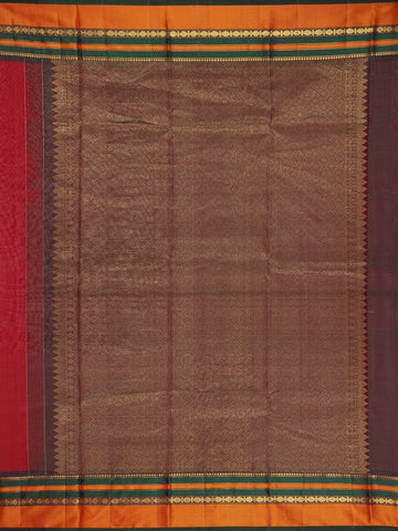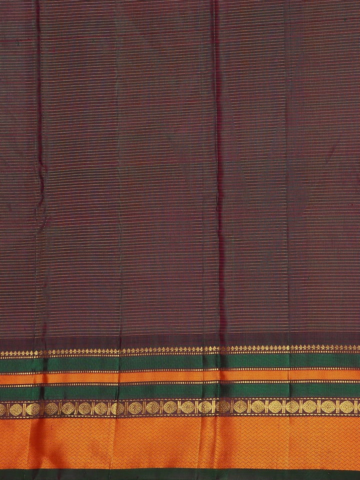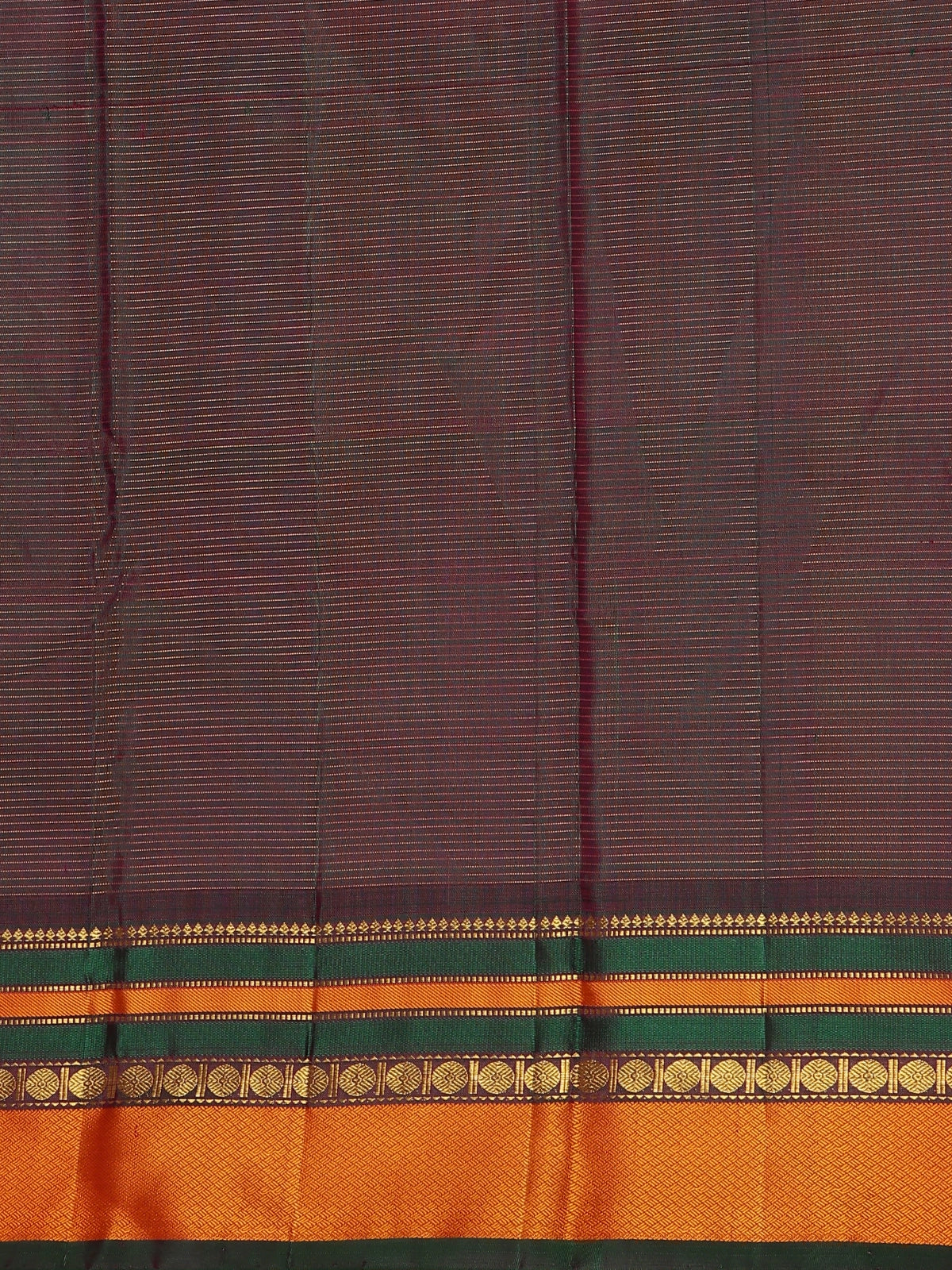 Paired with a contrasting brown blouse and pallu, the saree beautifully balances vibrancy with earthy warmth. The rich zari border gleams along the edges, enhancing its royal appeal and lending a festive allure that’s perfect for weddings, traditional functions, or cultural celebrations.