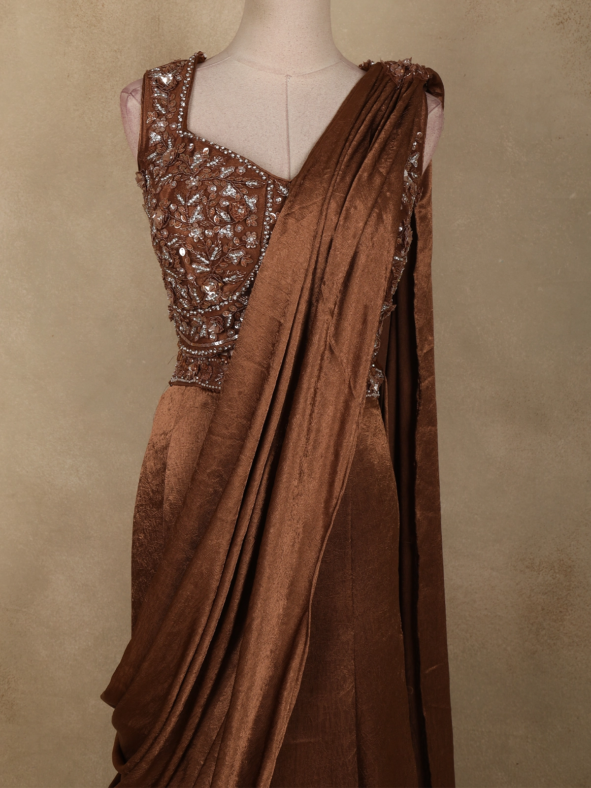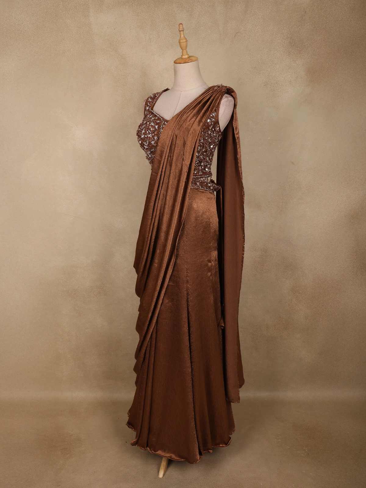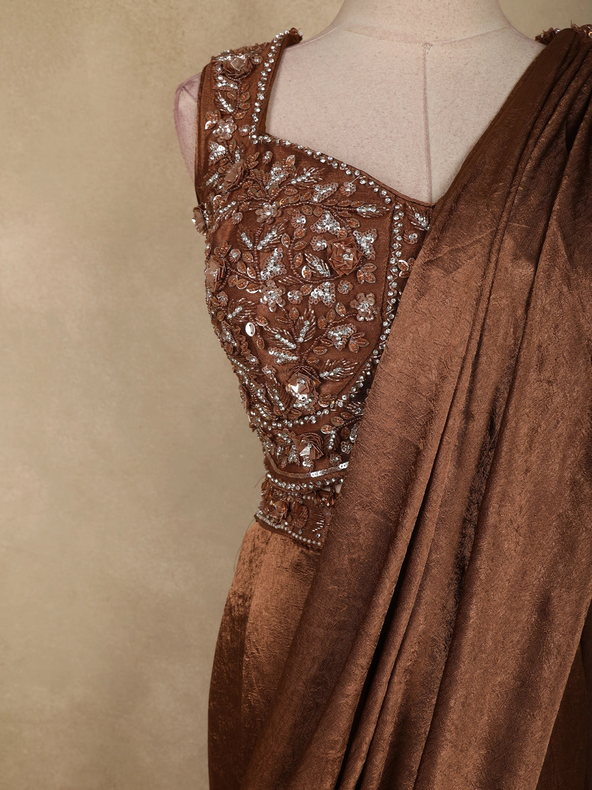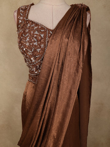 Rich Chocolate Brown Floral Sequins and Beads Embroidered Design Space Silk Lehenga with Drapped Dupatta