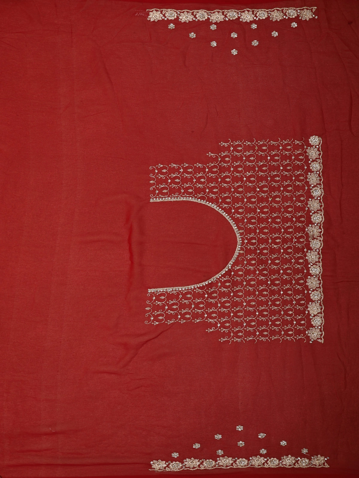 Step into timeless elegance with this Rich Crimson Red Georgette Designer Saree, crafted to exude soft glamour and refined sophistication. The saree is adorned with intricate floral zari embroidery delicately scattered across the body, creating a graceful shimmer that enhances its feminine charm without overpowering the look.