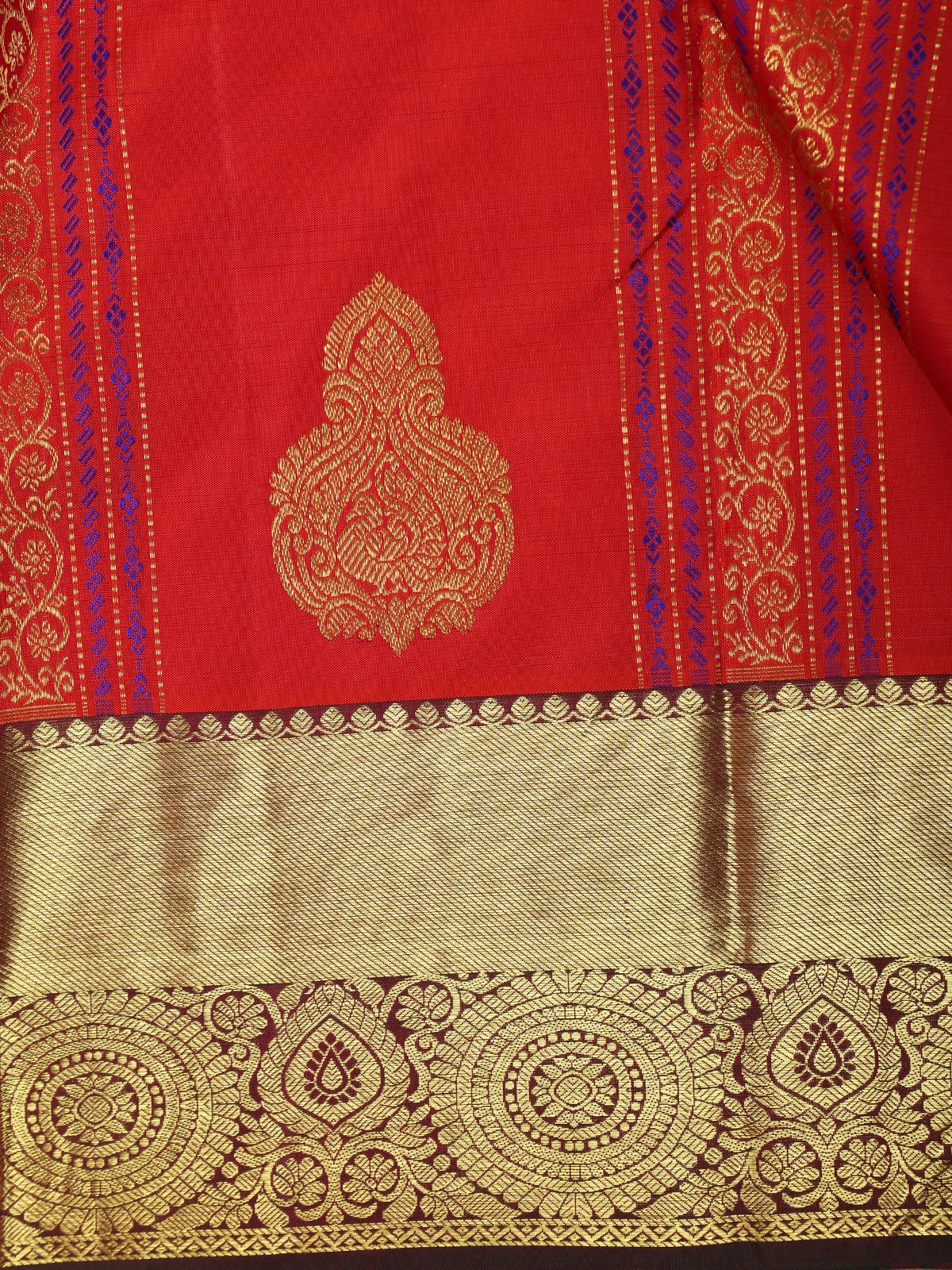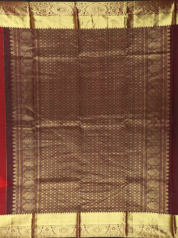The saree is beautifully framed with a contrast antique gold zari border, featuring intricate traditional patterns that enhance its rich appeal. Complemented by a deep maroon blouse with shimmering zari detailing, the ensemble exudes festive sophistication and bridal elegance. The silk drapes gracefully with a natural sheen, offering both structure and fluidity.