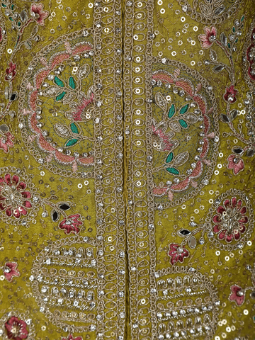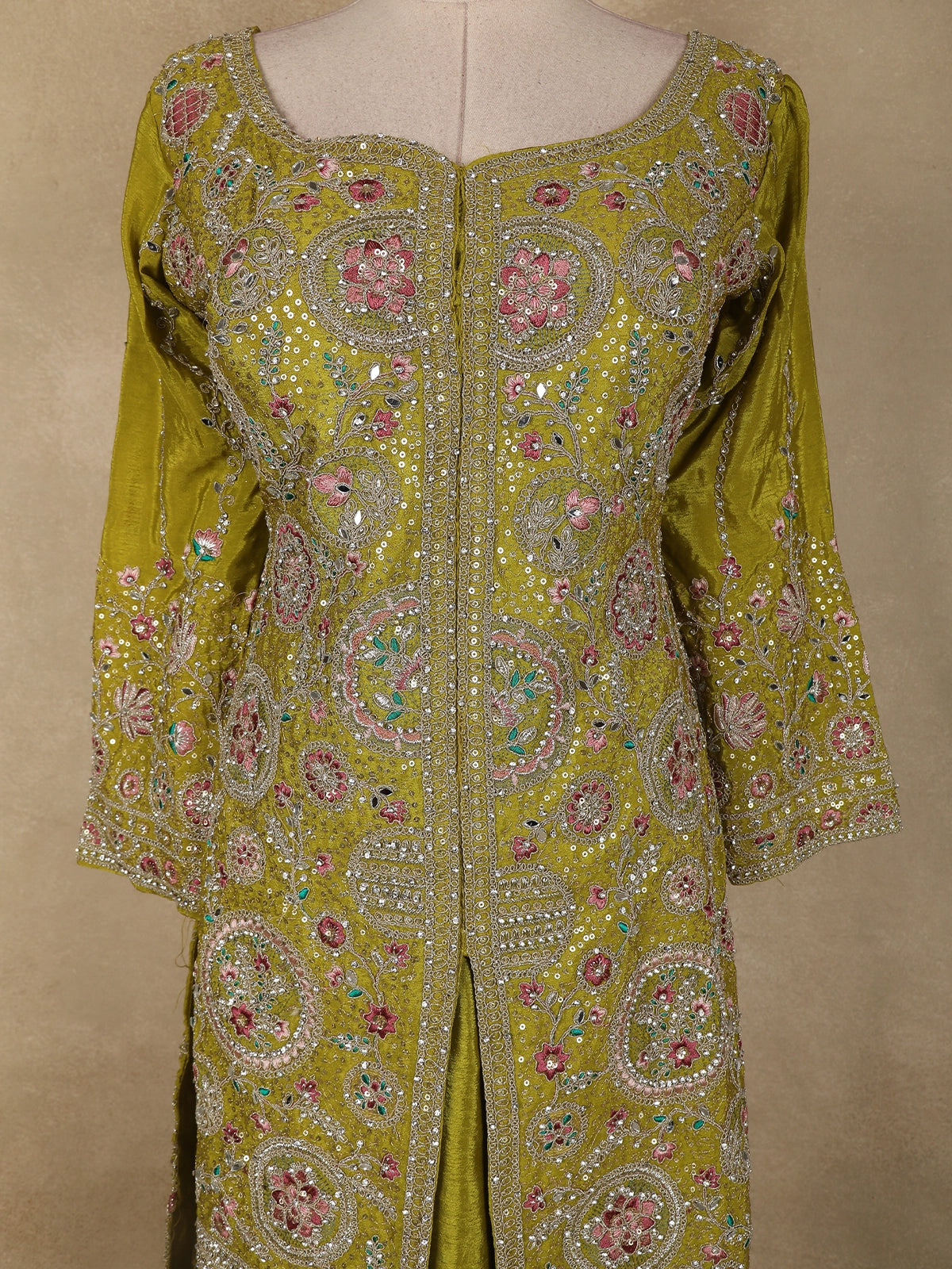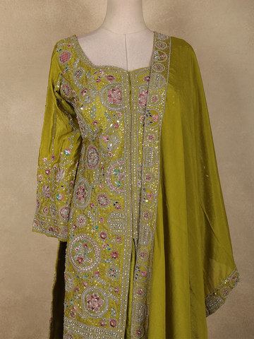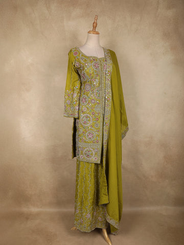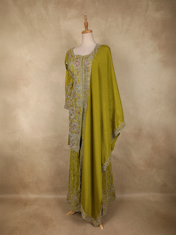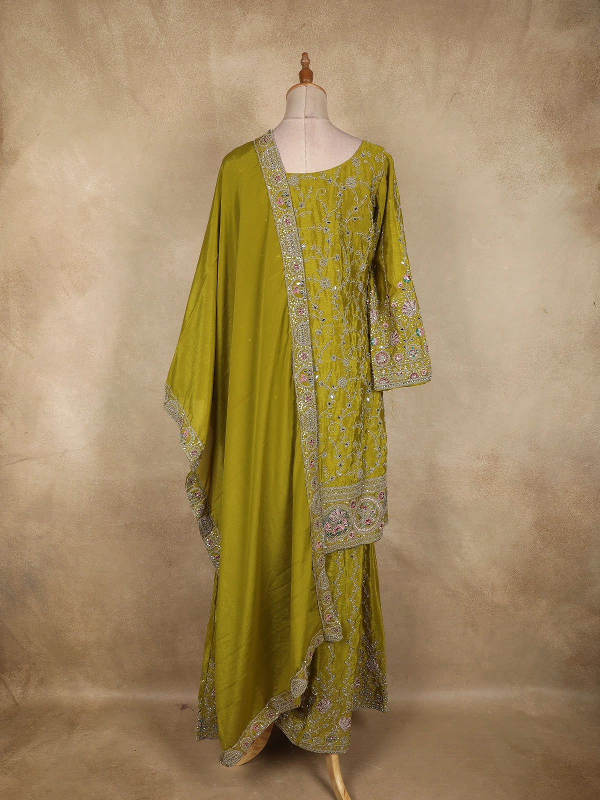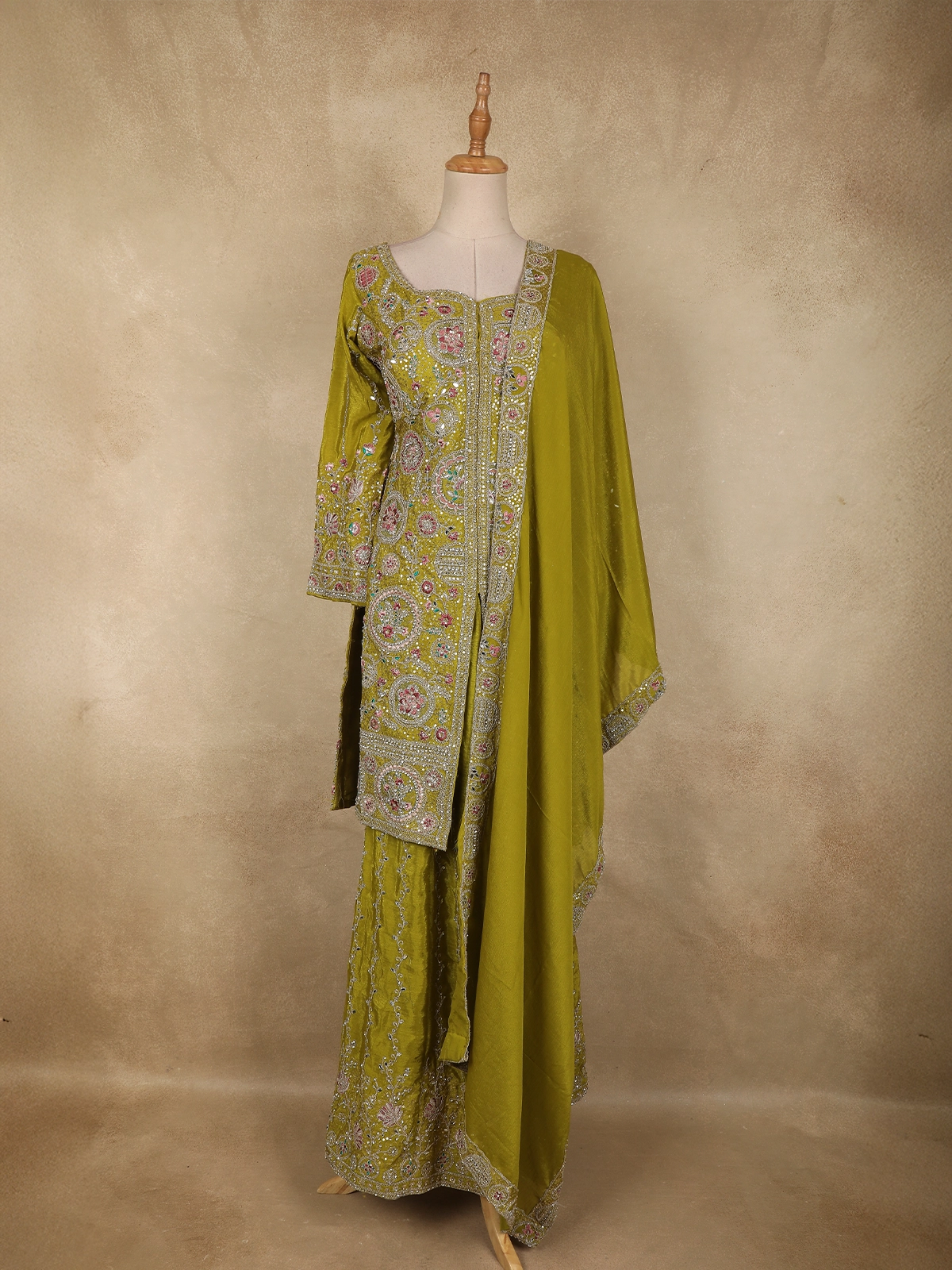 Rich Olive Green Floral Sequins and Beads Embroidered Design Georgette Palazzo Set with Dupatta