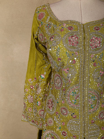 Make a striking statement with this Rich Olive Green Floral Sequins and Beads Embroidered Design Georgette Palazzo Set, designed to exude timeless elegance and festive charm. Crafted in flowy georgette, the kurta showcases intricate floral motifs highlighted with shimmering sequins, delicate beadwork, and fine thread embroidery that lend a luxurious, handcrafted appeal. The richly detailed embroidery is beautifully balanced with ornate borders, enhancing the overall sophistication of the ensemble.