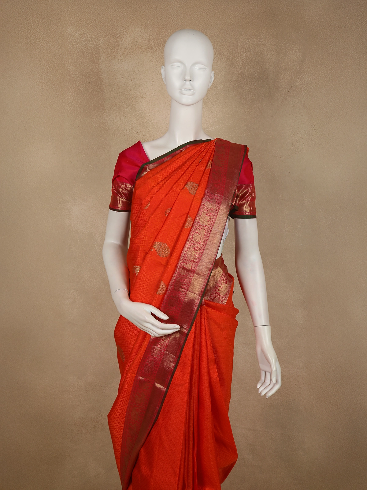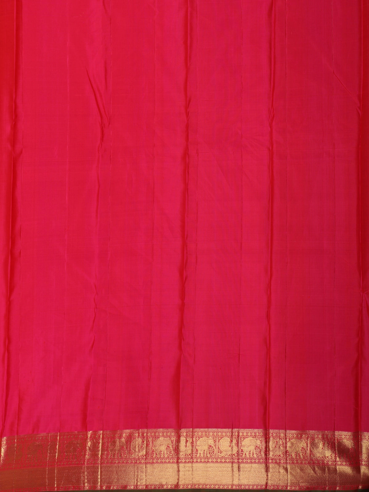 Framing the saree is a striking contrast deep maroon border, richly highlighted with gold zari detailing that adds a regal finish. The pallu continues the opulent zari work, creating a harmonious balance between vibrancy and tradition. Paired with a contrast magenta blouse with gold-toned sleeves, this Kanchipuram silk saree is an exquisite choice for weddings, festive celebrations, temple occasions, and bridal trousseaus, making it a classic heirloom-worthy piece.