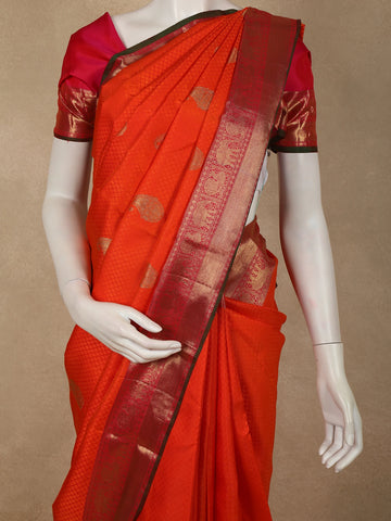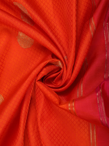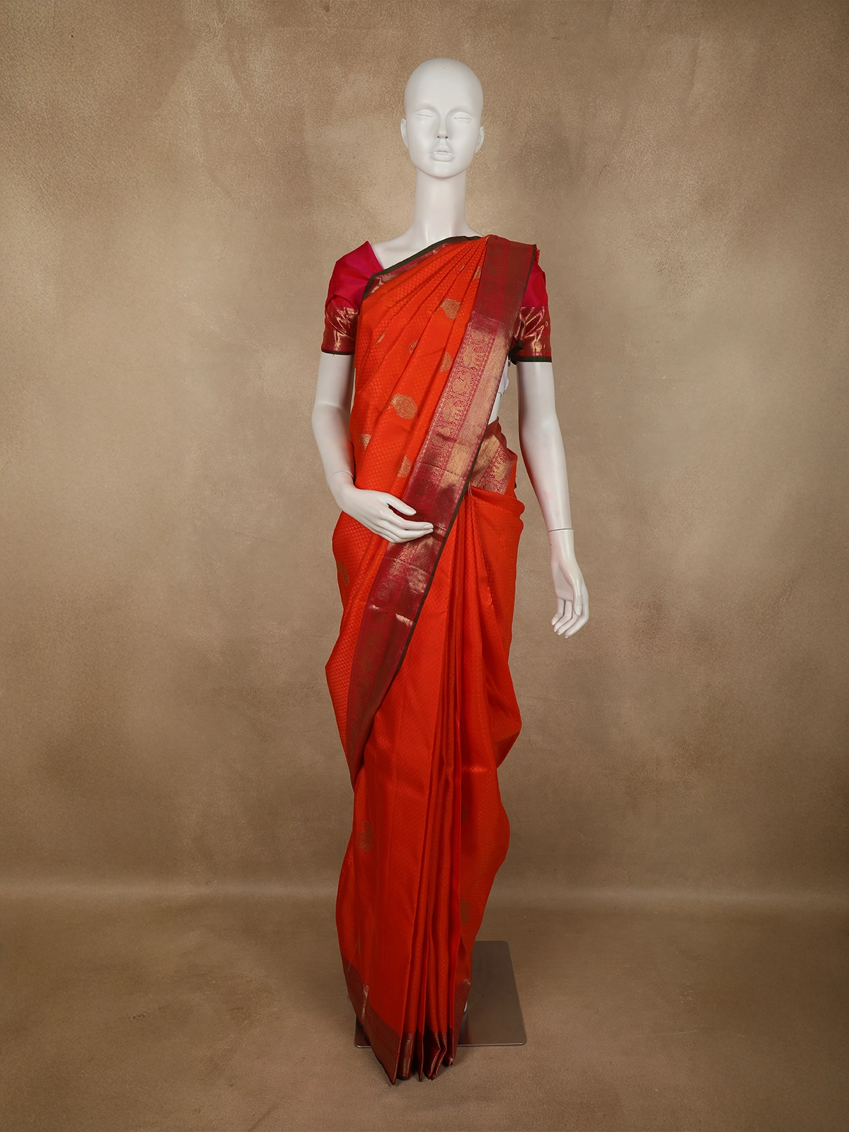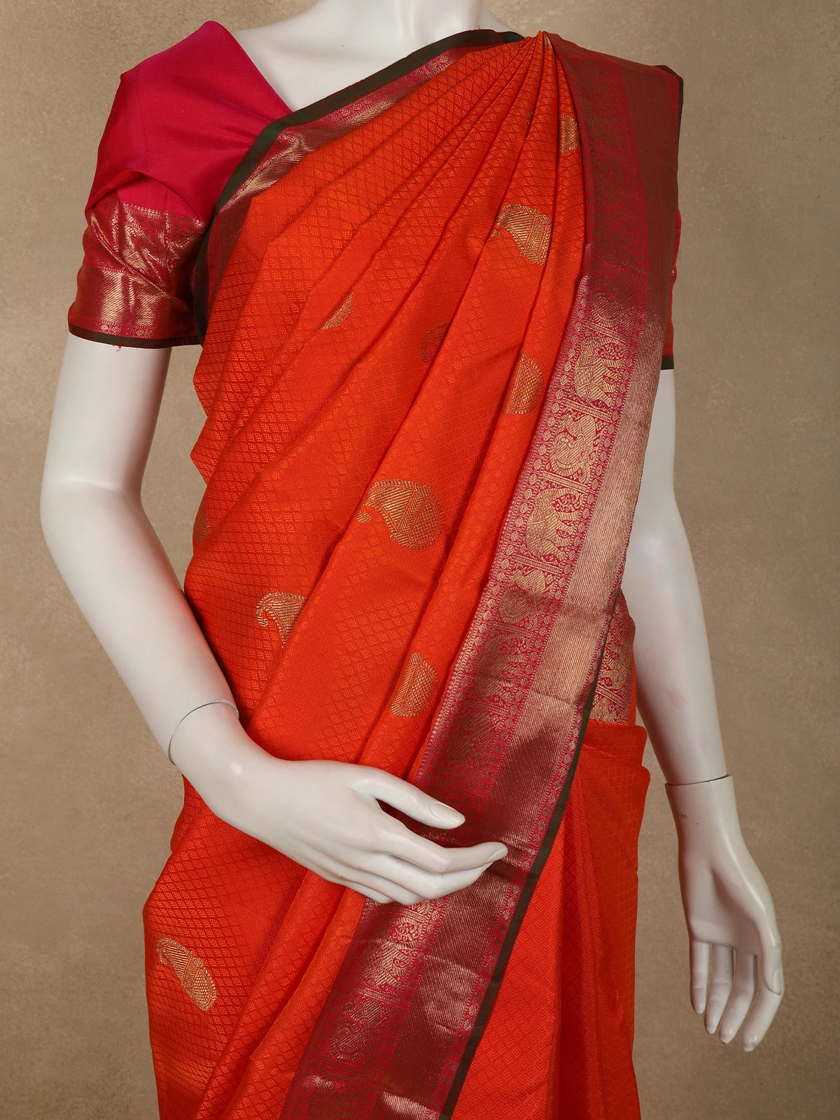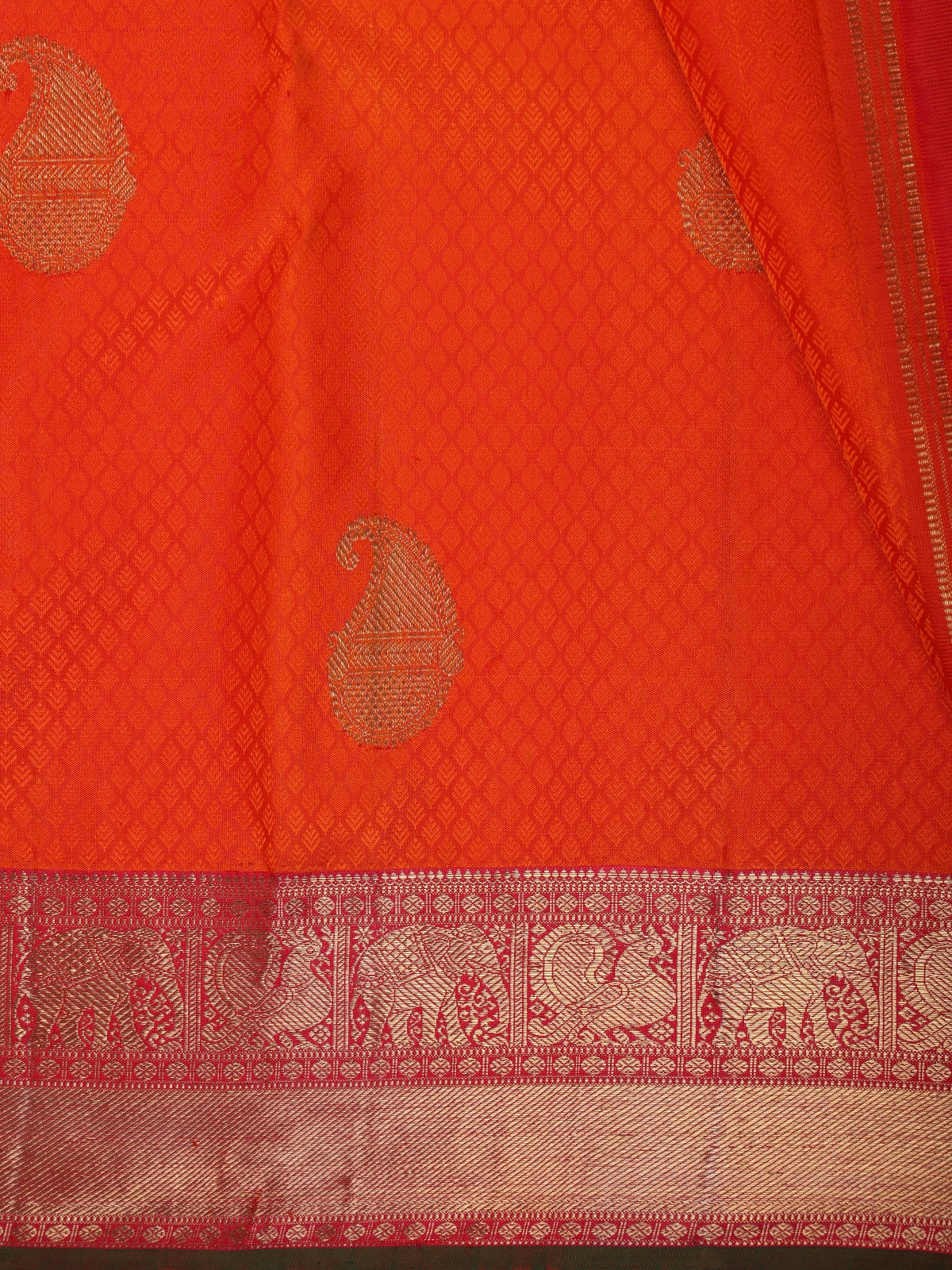 This Rich Orange Pure Kanchipuram Silk Saree radiates traditional grandeur with its vibrant hue and classic woven artistry. The lustrous orange silk body is elegantly adorned with paisley butta motifs, intricately woven in antique gold zari, lending the saree a graceful rhythm and timeless appeal. The subtle self-patterned weave across the body enhances the depth and richness of the silk.
