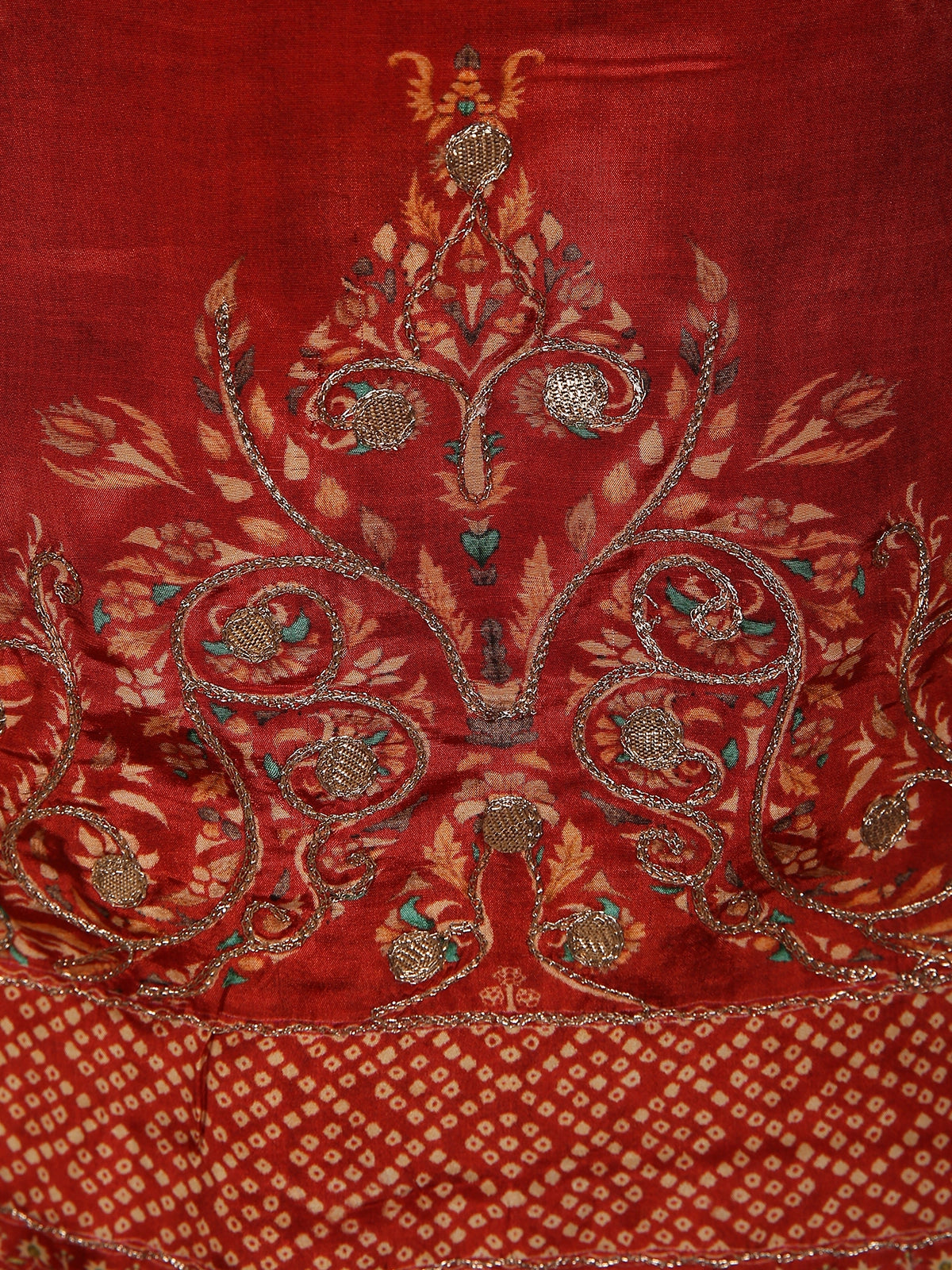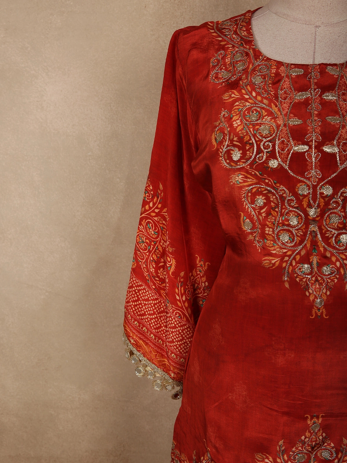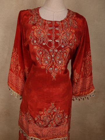 The kurta is adorned with intricate floral prints and highlighted by detailed ornamental motifs across the yoke, adding a touch of classic charm. The rich rusty maroon red base is beautifully enhanced with subtle contrast patterns, giving the outfit depth and visual richness. The relaxed silhouette ensures ease of movement while maintaining a polished ethnic look.