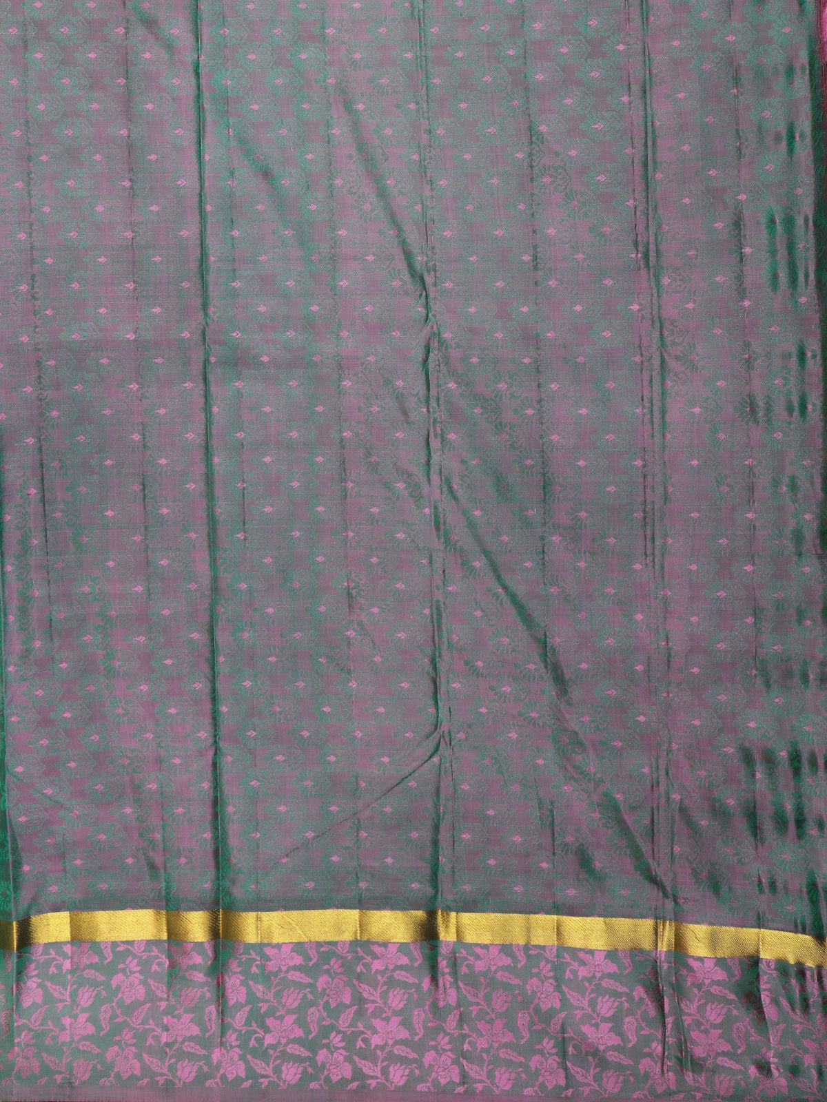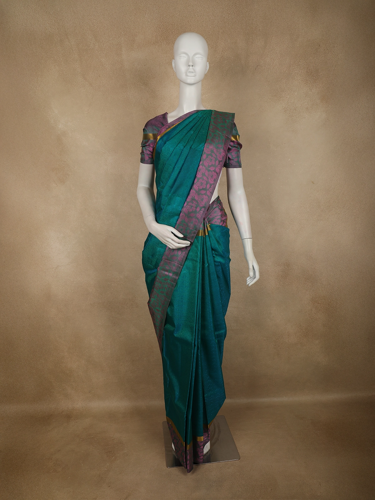 Enhancing its beauty is the contrast floral woven border, intricately detailed in a complementary purple tone with subtle zari accents. The floral motifs add a refined decorative touch, while the contrast border lends a striking visual balance to the saree. The coordinated contrast blouse further elevates the traditional appeal of the ensemble.