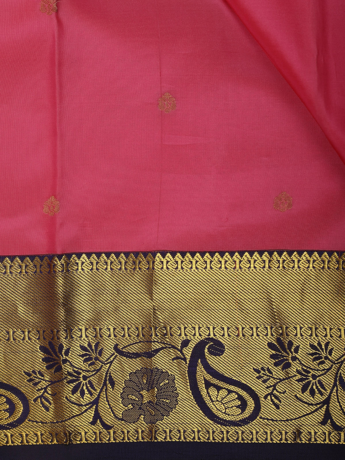 The saree is beautifully highlighted by a rich contrast border in antique gold zari, intricately woven with floral and paisley patterns accented in deep navy tones. This ornate border adds depth, grandeur, and a striking visual contrast, elevating the saree’s heritage appeal. The harmonious blend of rose pink, antique gold, and navy lends a regal yet graceful finish.