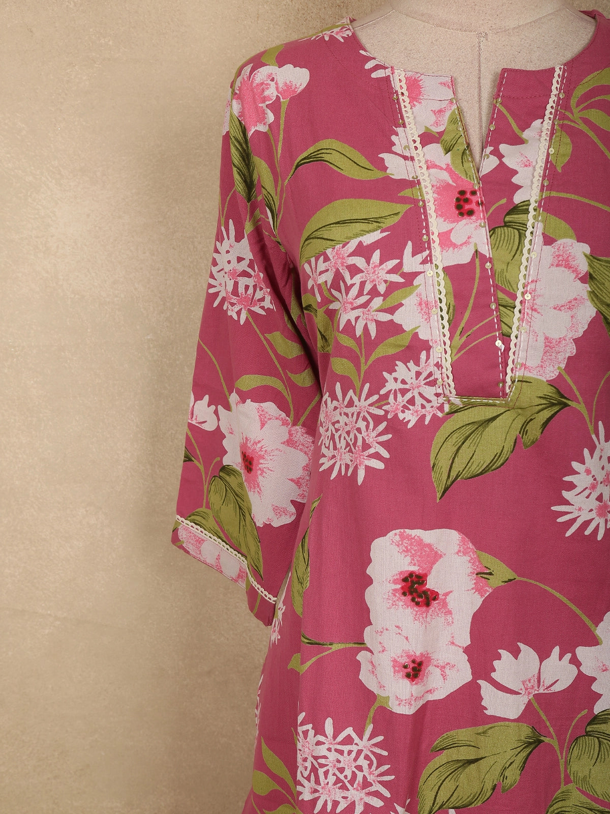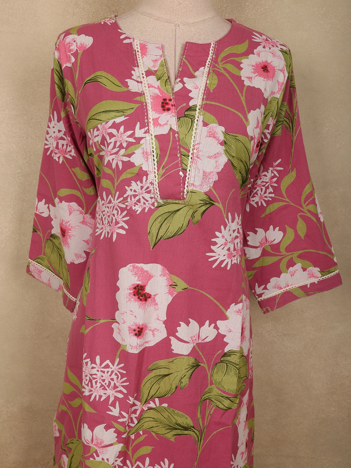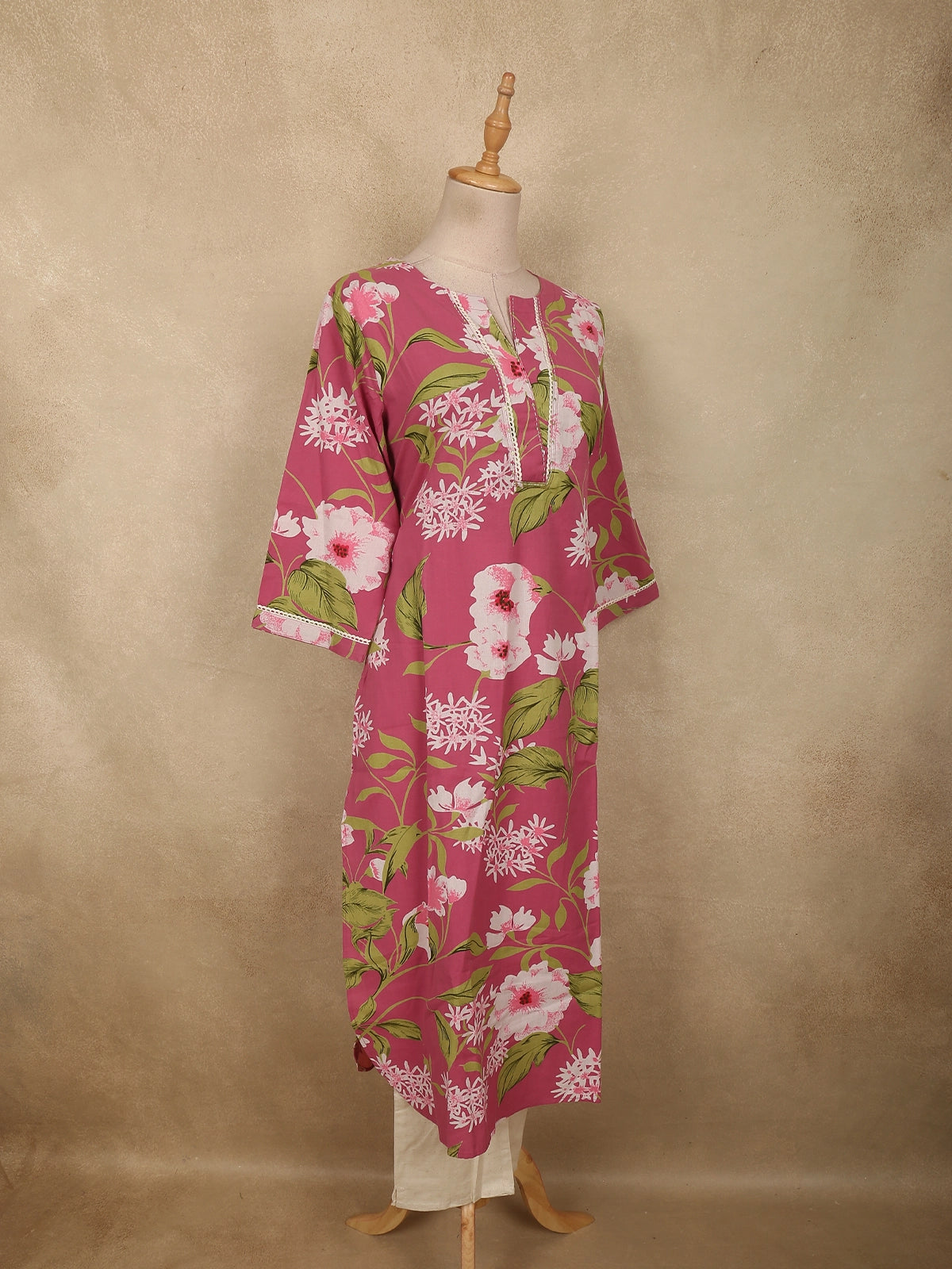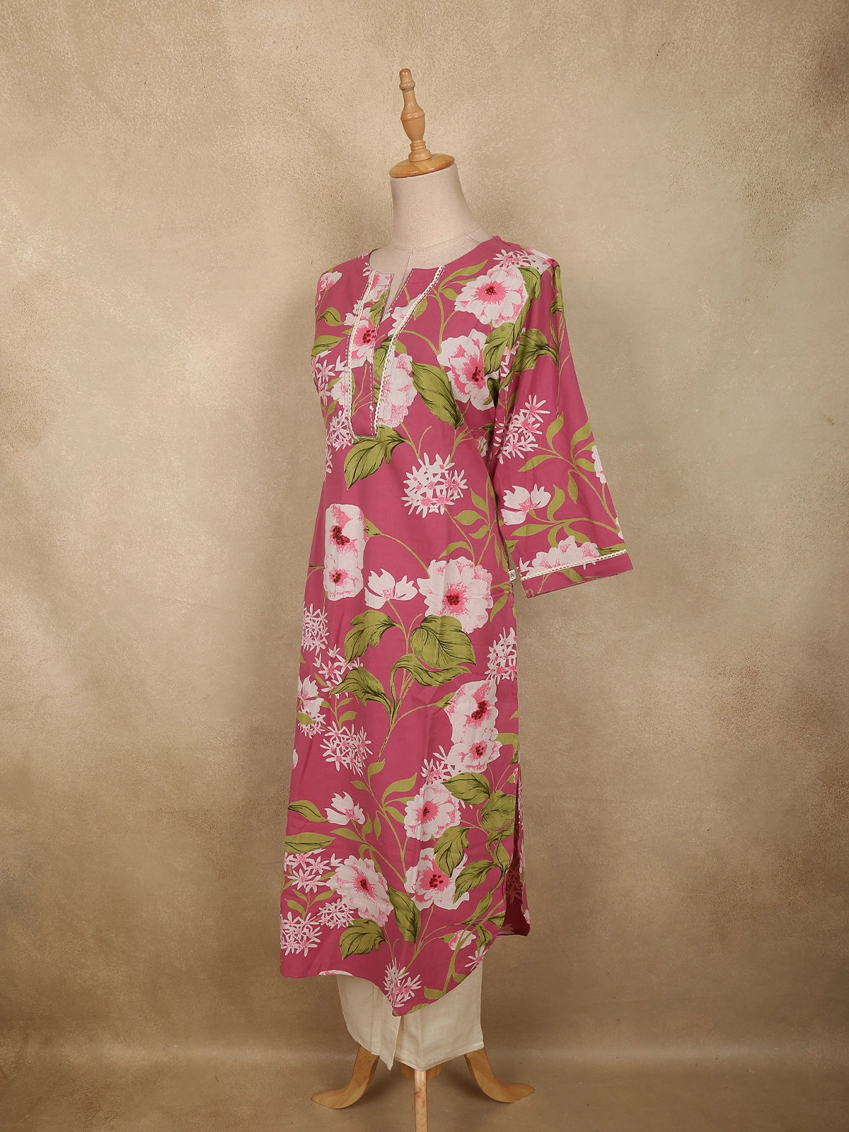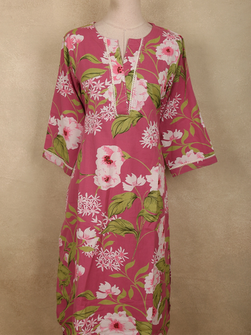 The straight-cut kurta is tailored from soft cotton fabric, offering a comfortable and breathable feel perfect for all-day wear. The design is adorned with delicate floral prints spread across the fabric, bringing a lively and feminine aesthetic to the ensemble. The round neckline with subtle front placket detailing adds a refined touch, while the three-quarter sleeves with delicate borders enhance the overall elegance of the outfit.