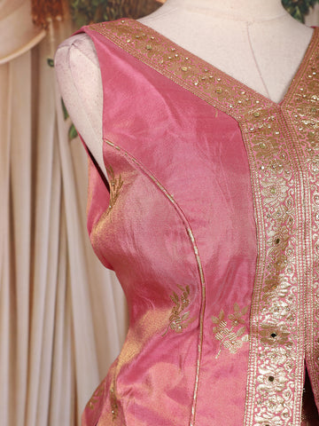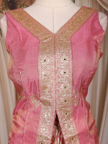 Step into refined elegance with this Rose Pink Silk lehenga set adorned with intricate golden zari woven motifs. The sleeveless peplum-style blouse features a V-neckline accentuated by a detailed zari border and fabric-covered buttons down the front, lending it a touch of regal charm. The lehenga is richly decorated with floral zari weaving throughout, creating a subtle yet luxurious shimmer. Paired with a matching dupatta showcasing ornate zari borders and tassel detailing, this ensemble radiates grace and grandeur — perfect for festive occasions, weddings, or elegant celebrations.