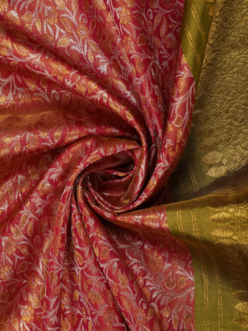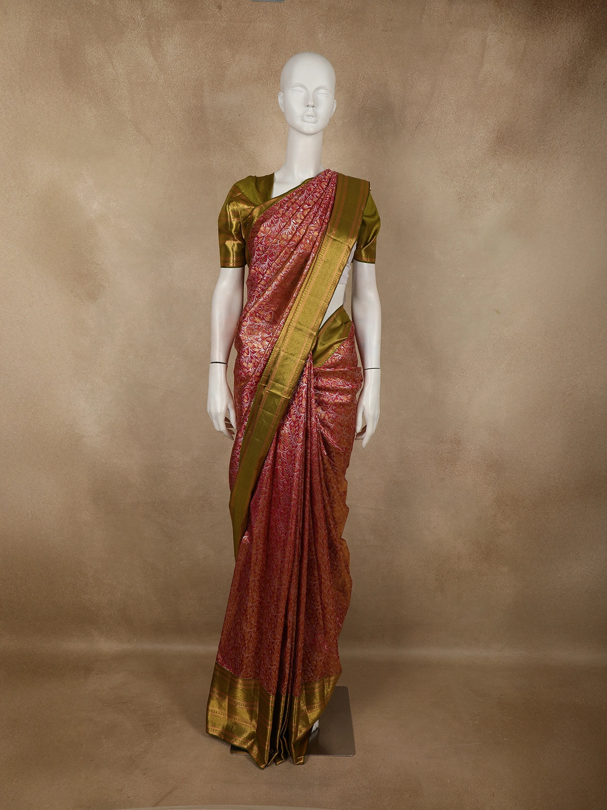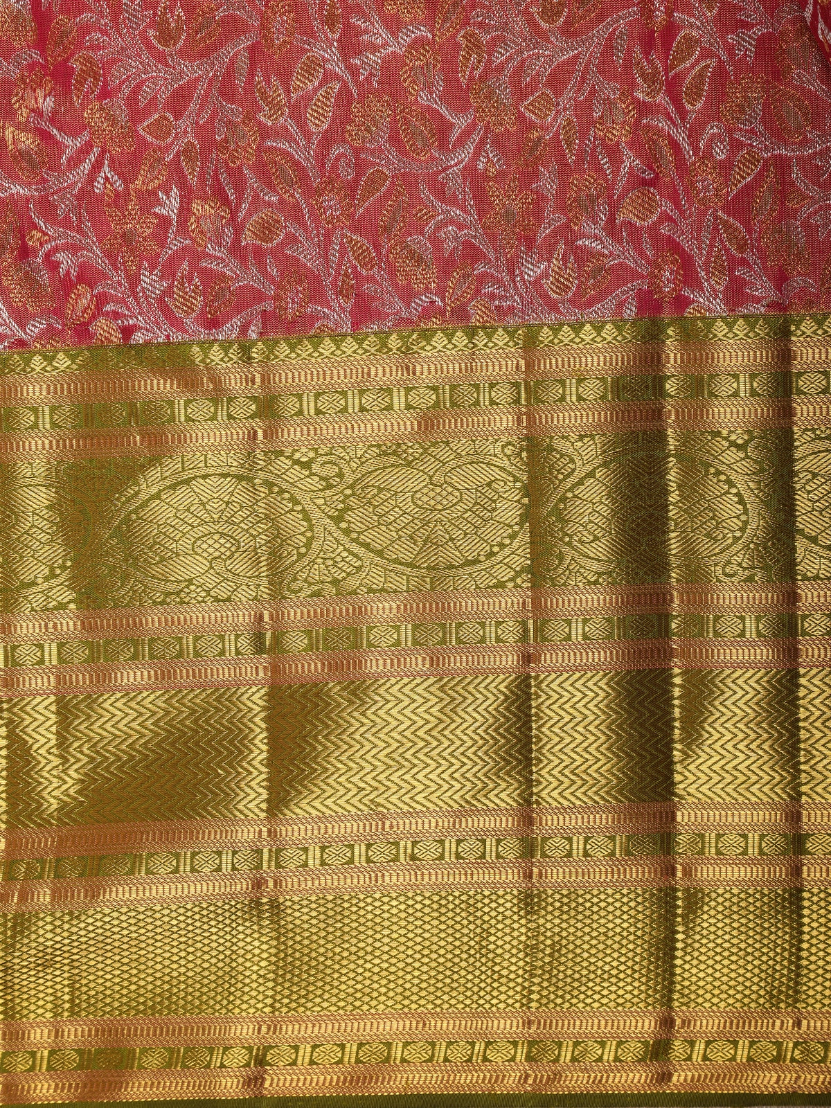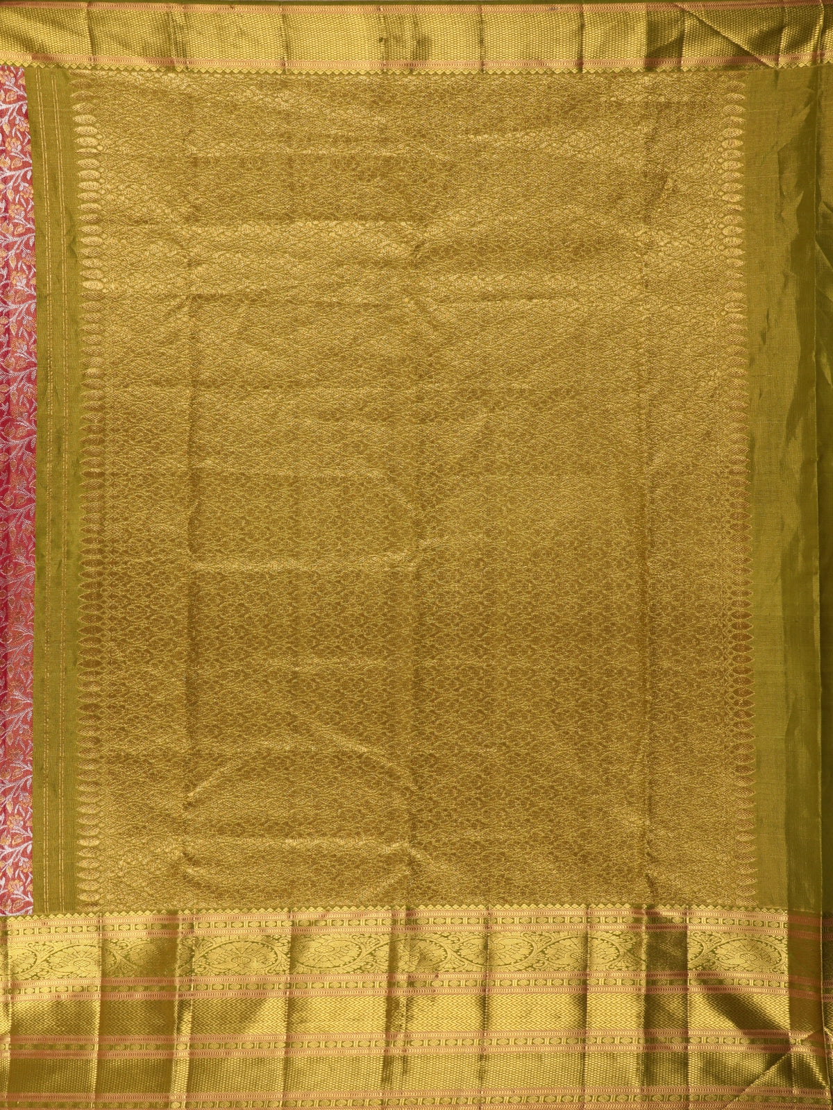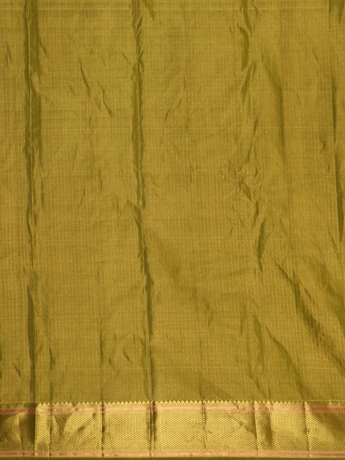 A beautifully crafted contrast zari border in muted olive green with rich gold detailing frames the saree elegantly, creating a striking yet harmonious contrast. Woven in pure Kanchipuram silk, the saree offers a lustrous texture, graceful drape, and enduring quality.