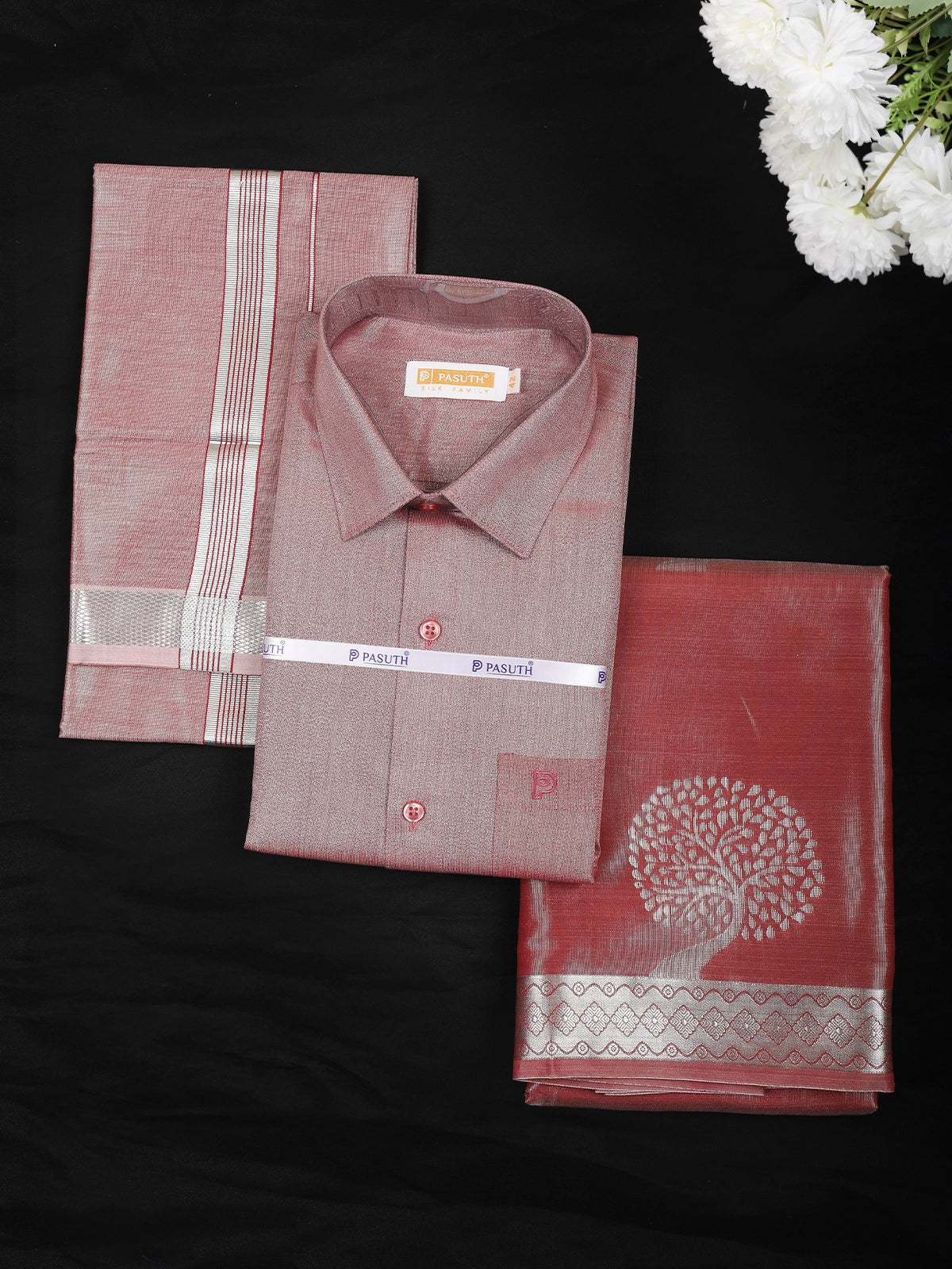 Celebrate tradition with elegance in this beautifully coordinated family combo set, featuring a men’s rosewood silk shirt with matching dhoti and a stunning saree enhanced with a silver zari Tree Motif. Designed for special occasions, this set offers a harmonious colour palette and exquisite craftsmanship—making it the ideal choice for weddings, poojas, and couple wear styling.