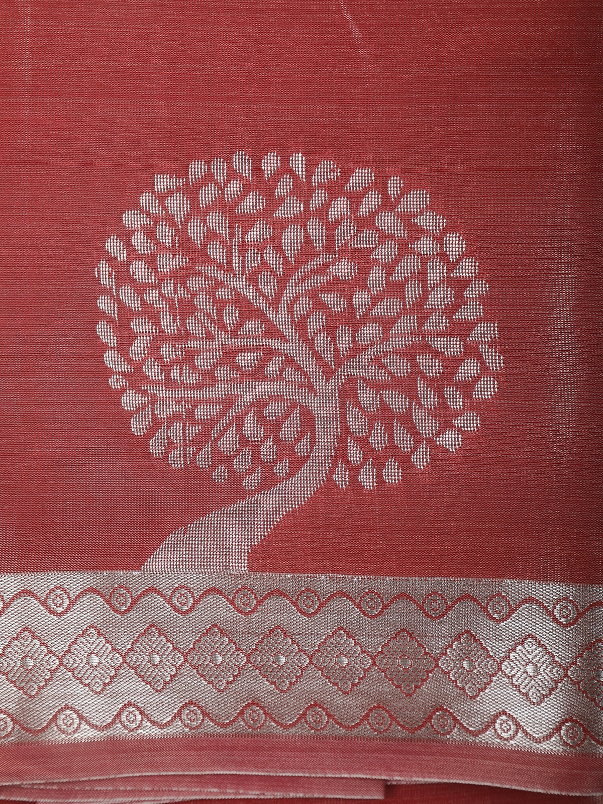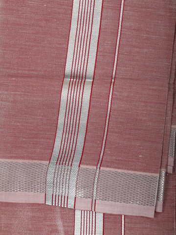 The beautifully matching saree features a rich rosewood base adorned with a silver zari Tree of Life motif on the pallu along with an elegantly woven geometric zari border, giving it a graceful and refined finish. The color coordination between the shirt, dhoti, and saree makes this set a perfect pick for couple twinning and traditional events.