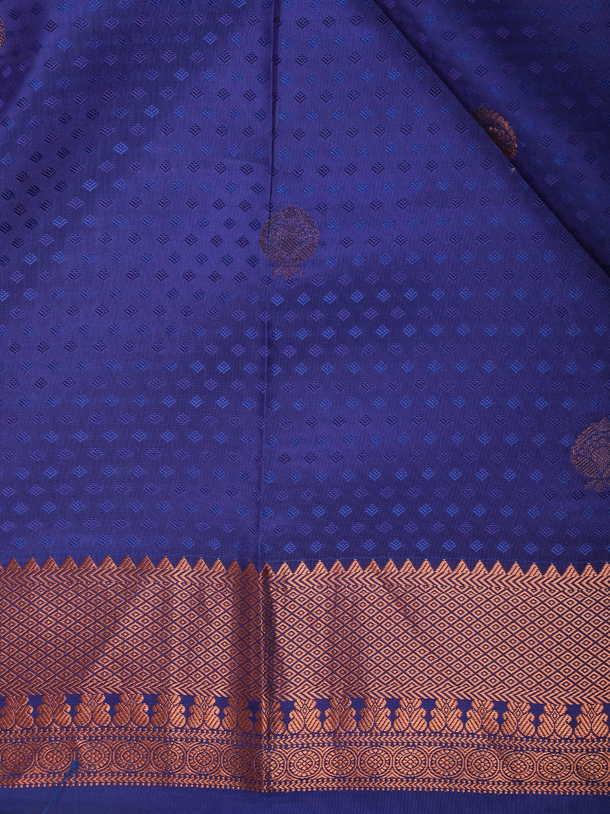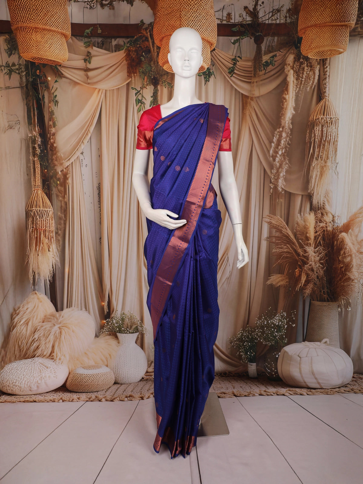 This elegant Royal Blue soft silk saree is beautifully adorned with delicate butta motifs woven evenly across the body, creating a refined texture that enhances its rich, lustrous appeal. The deep royal blue base exudes sophistication, while the subtle woven pattern adds depth without overpowering the overall look. Complementing the body is a striking contrast border, intricately crafted with traditional zari weaving that lends a graceful festive finish to the saree. The smooth soft silk fabric ensures a comfortable drape with a gentle sheen, making it ideal for long wear. Perfect for weddings, festive occasions, family functions, and traditional celebrations, this saree blends classic charm with contemporary elegance, making it a versatile addition to any ethnic wardrobe.