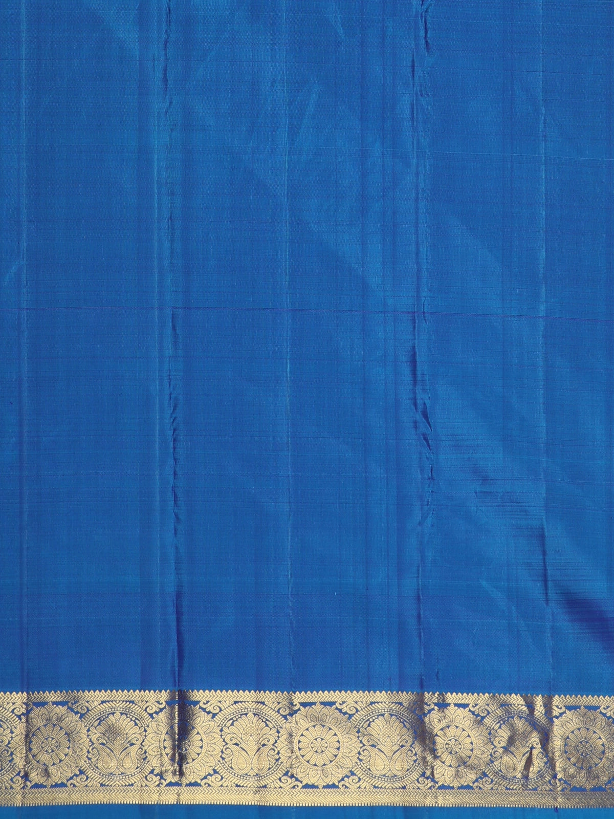 The saree is accentuated with a striking contrast zari border in peacock blue, intricately detailed with traditional gold zari patterns that add a majestic finish to the drape. The silk’s natural sheen and structured weave ensure a graceful fall, making every pleat look rich and refined.