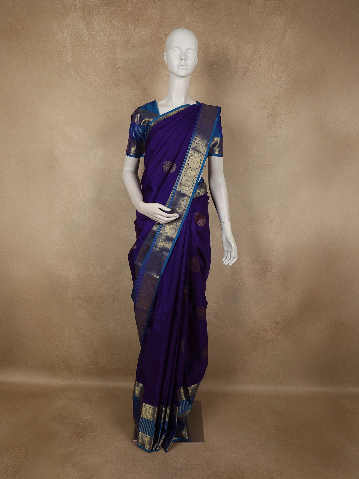An ideal choice for weddings, festive occasions, and temple ceremonies, this saree pairs beautifully with antique gold jewellery and a matching peacock blue or royal blue blouse. A timeless piece that celebrates heritage, elegance, and ceremonial grandeur.