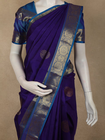 This Royal Blue Butta Zari Woven Design Pure Kanchipuram Silk Saree is a classic embodiment of regal elegance and timeless South Indian craftsmanship. Crafted from luxurious pure Kanchipuram silk, the saree features a rich royal blue base that exudes depth and grandeur, enhanced by finely woven butta motifs in luminous gold zari scattered gracefully across the body.