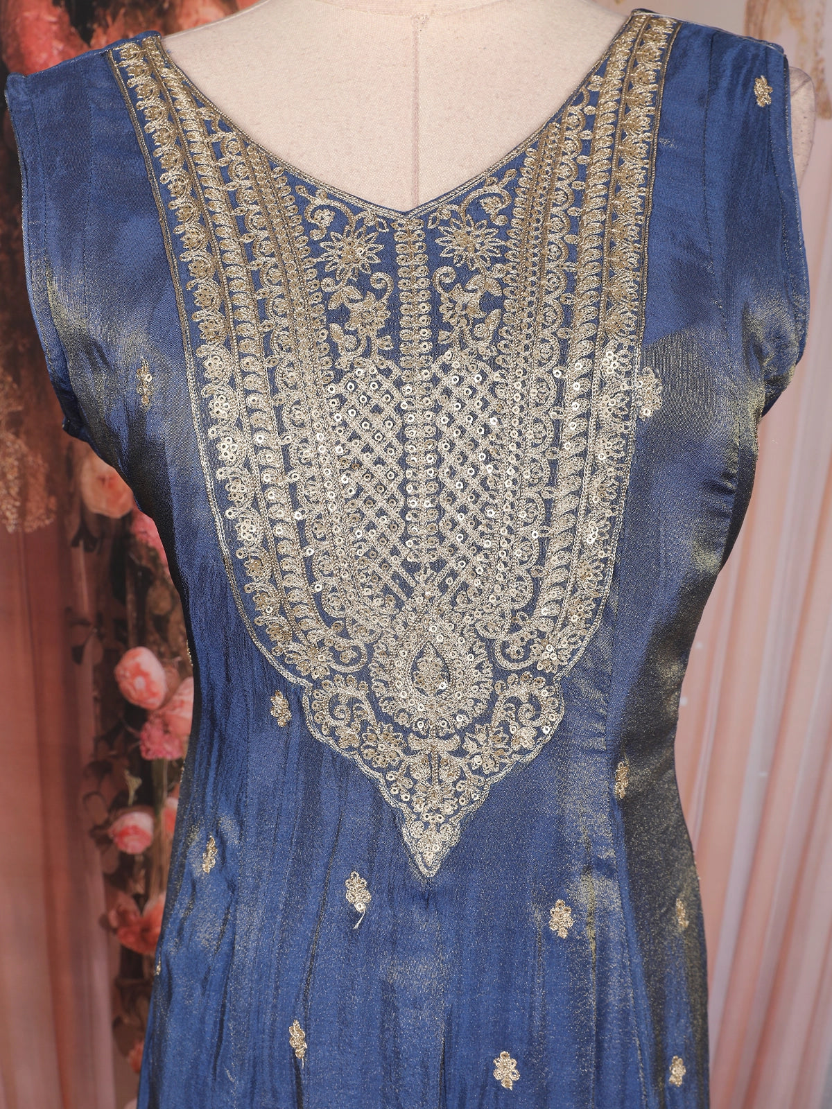 The bodice features a detailed floral embroidered yoke, highlighted with subtle zari and sequins work, creating a luxurious and sophisticated look. The sleeveless cut and V-neckline add a graceful modern touch while maintaining traditional appeal.