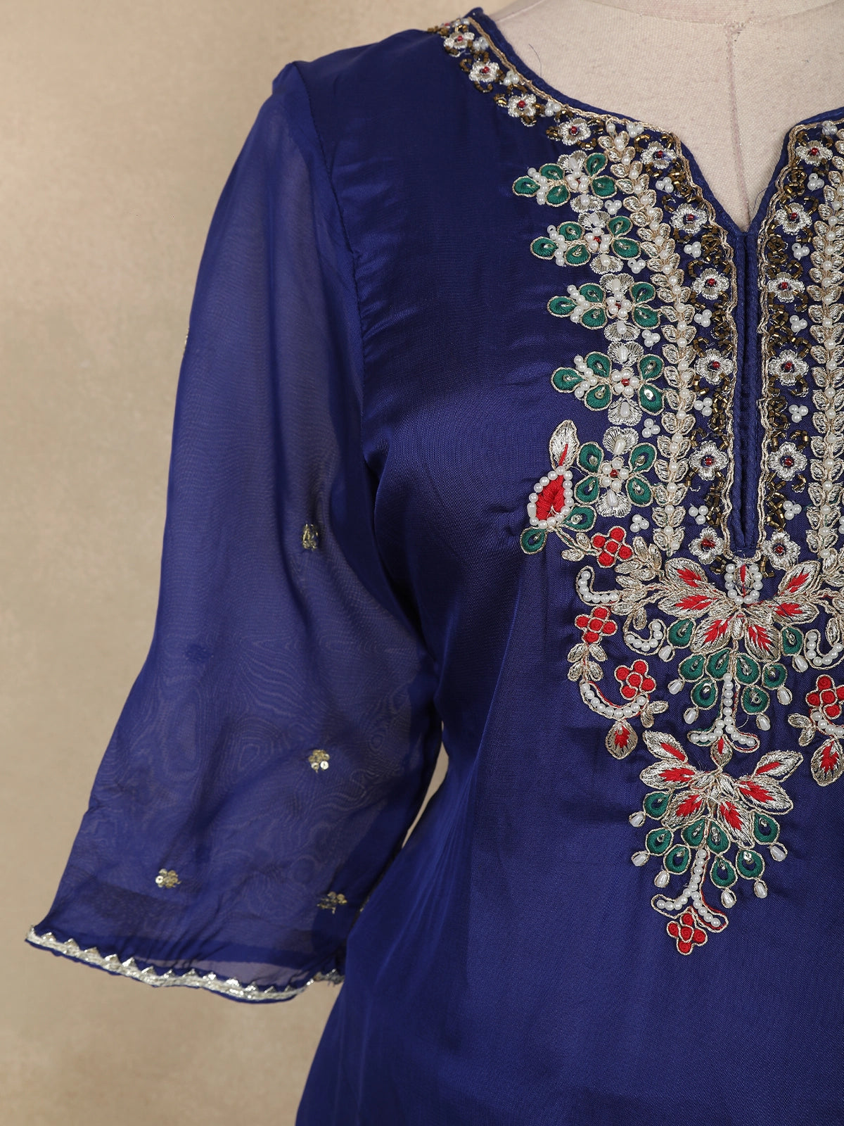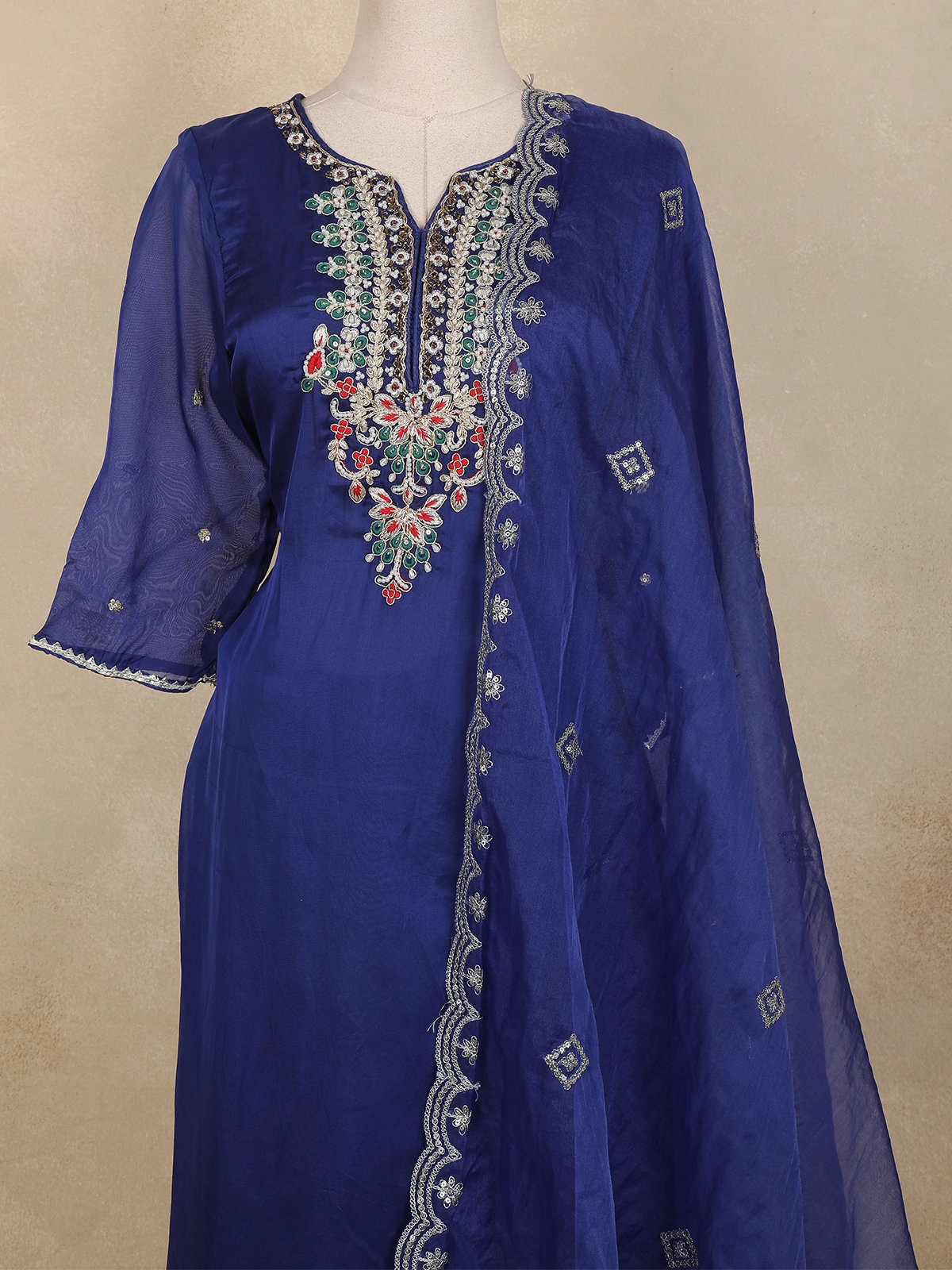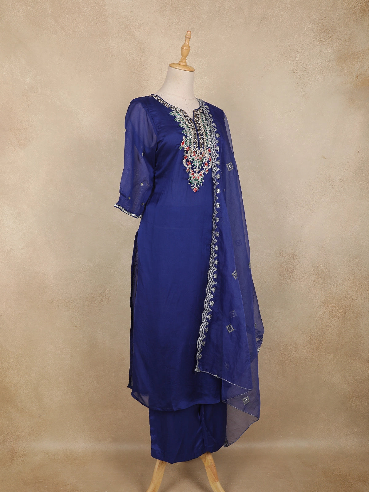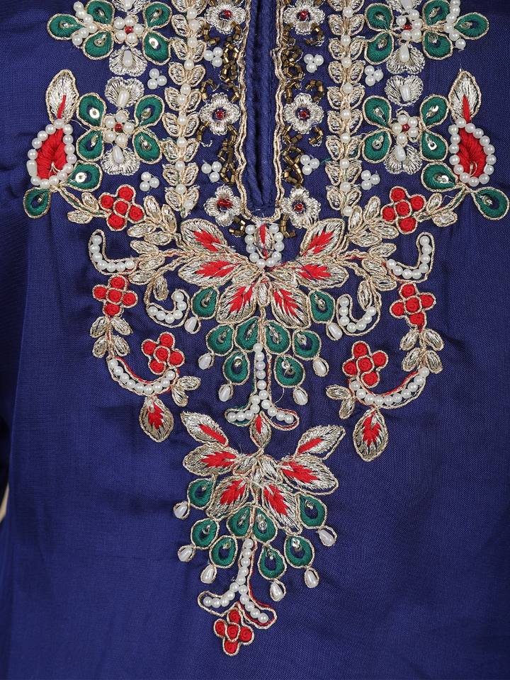 Step into elegance with this royal blue salwar suit crafted in luxurious tissue silk. The intricately embroidered floral motifs with subtle sequin highlights make it a standout ensemble for festive occasions and celebrations. The sheer sleeves and beautifully designed neckline add a graceful charm, while the matching dupatta completes the sophisticated look.