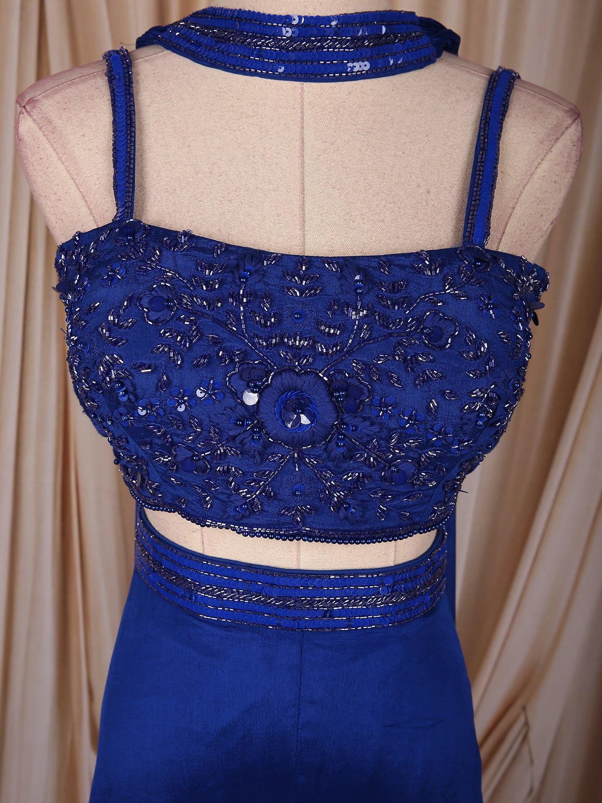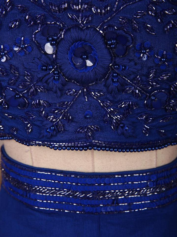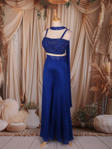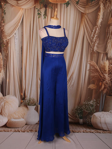 Dazzle in sophistication with this Royal Blue Georgette Palazzo Suit, designed to make a statement at every celebration. The ensemble features a heavily sequins-embroidered crop top, intricately detailed with beads and shimmering embellishments that reflect a perfect festive radiance. The strappy blouse design with a matching embellished neckline adds a modern and glamorous touch to this elegant outfit.