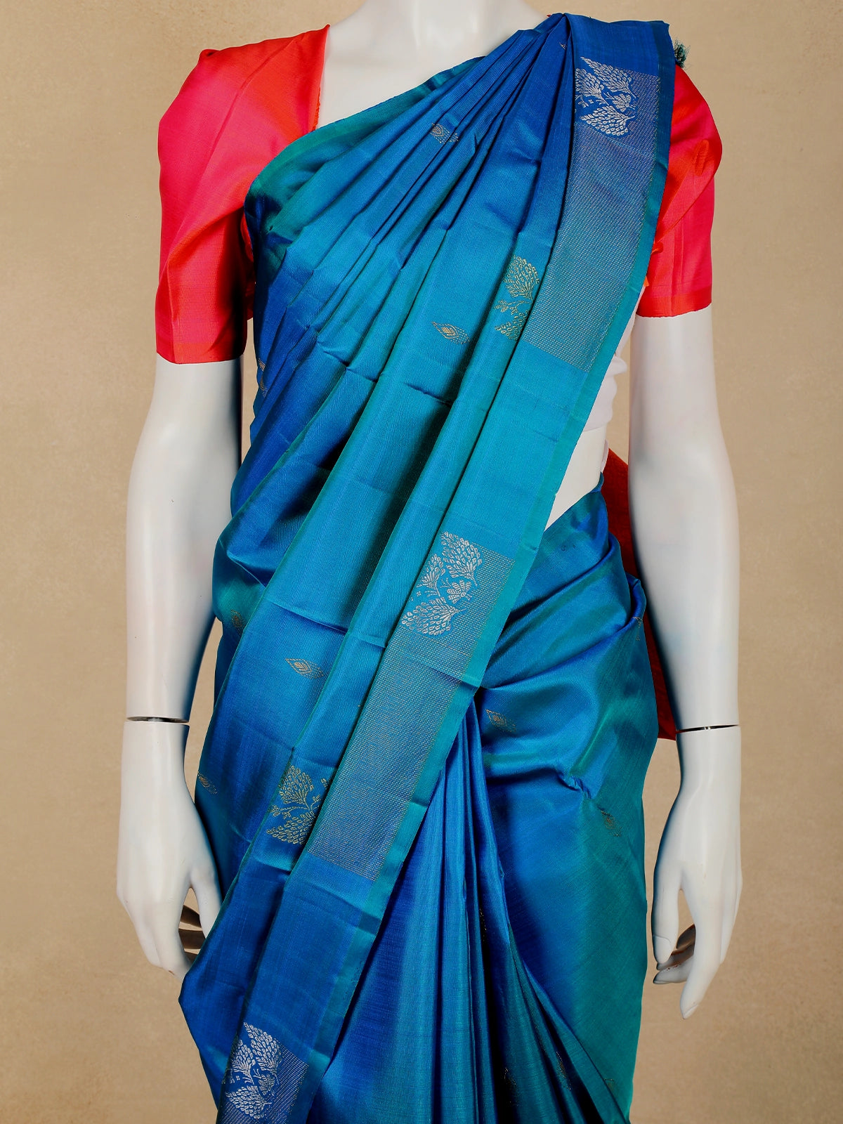 Step into timeless elegance with this Royal Blue Leaf Woven Design Pure Kanchipuram Silk Saree, a graceful expression of classic South Indian craftsmanship. The saree is rendered in a rich royal blue tone, radiating depth and sophistication, beautifully complemented by a subtle contrast of teal undertones that enhance its visual richness.