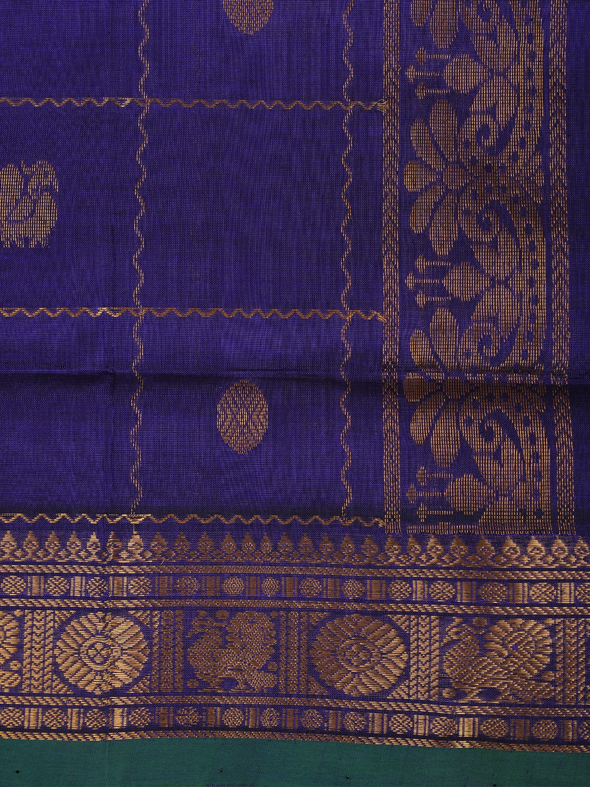 The contrast teal green border adds a striking finish, beautifully balancing the royal blue body and elevating the overall aesthetic. The matching pallu continues the zari detailing, completing the saree with a graceful and harmonious flow.