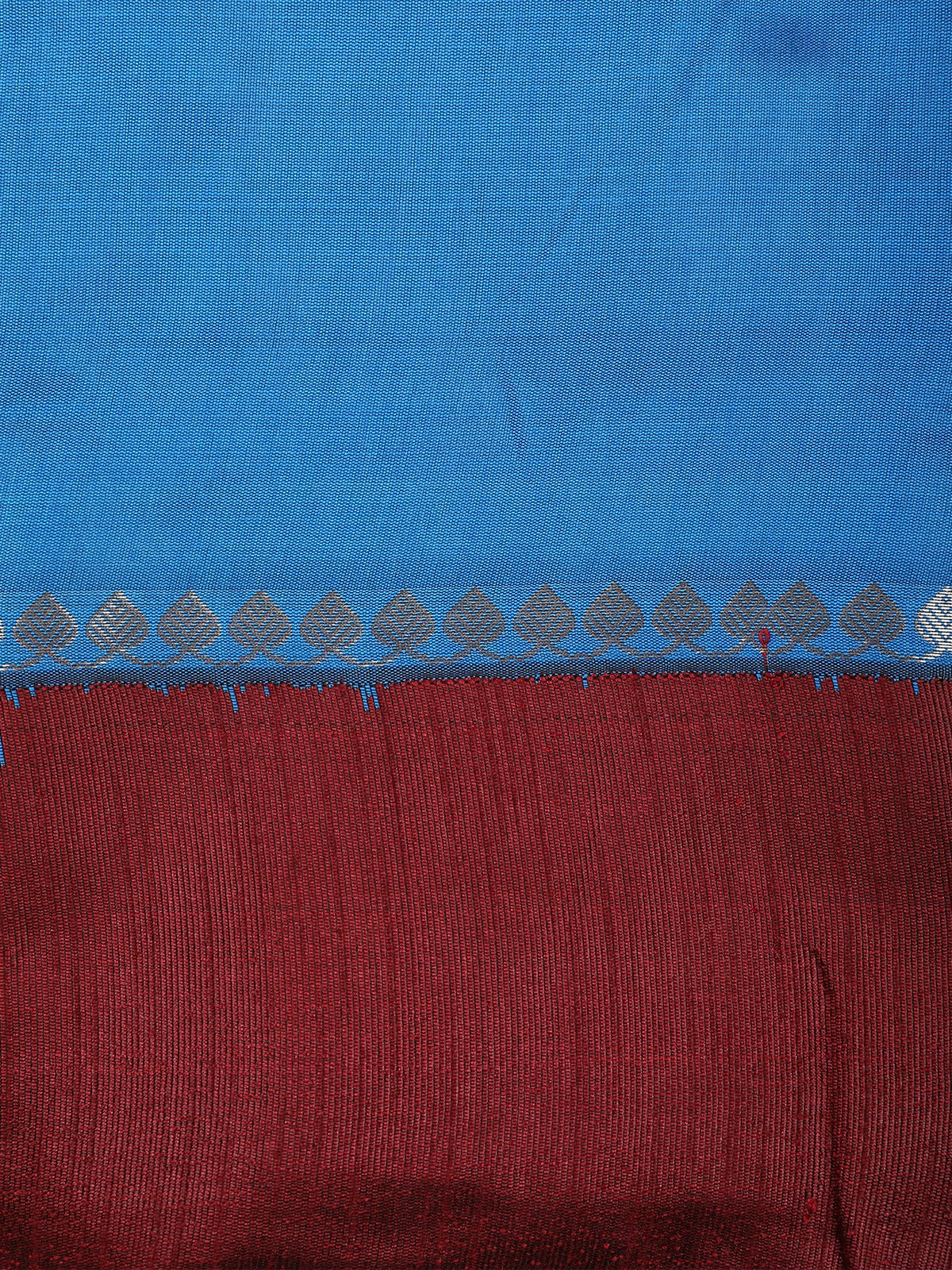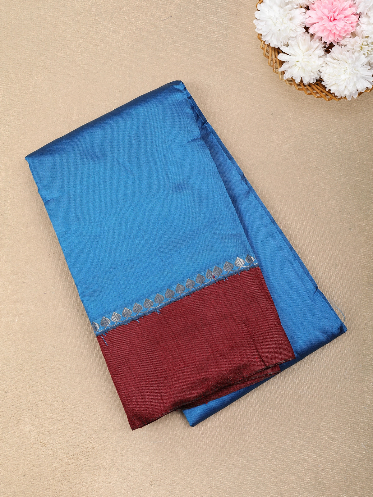 The saree is accentuated with a contrasting maroon border, woven with subtle zari detailing that adds depth and traditional charm. The fine zari work along the border enhances the overall appeal without overpowering the elegant solid base, creating a perfect balance of simplicity and grandeur.