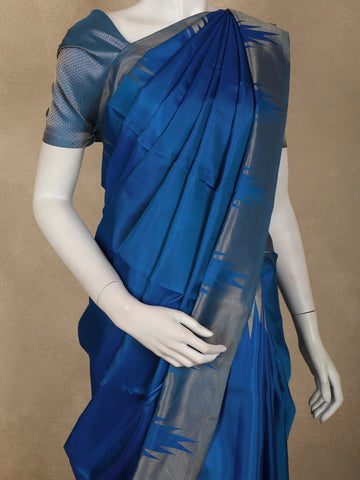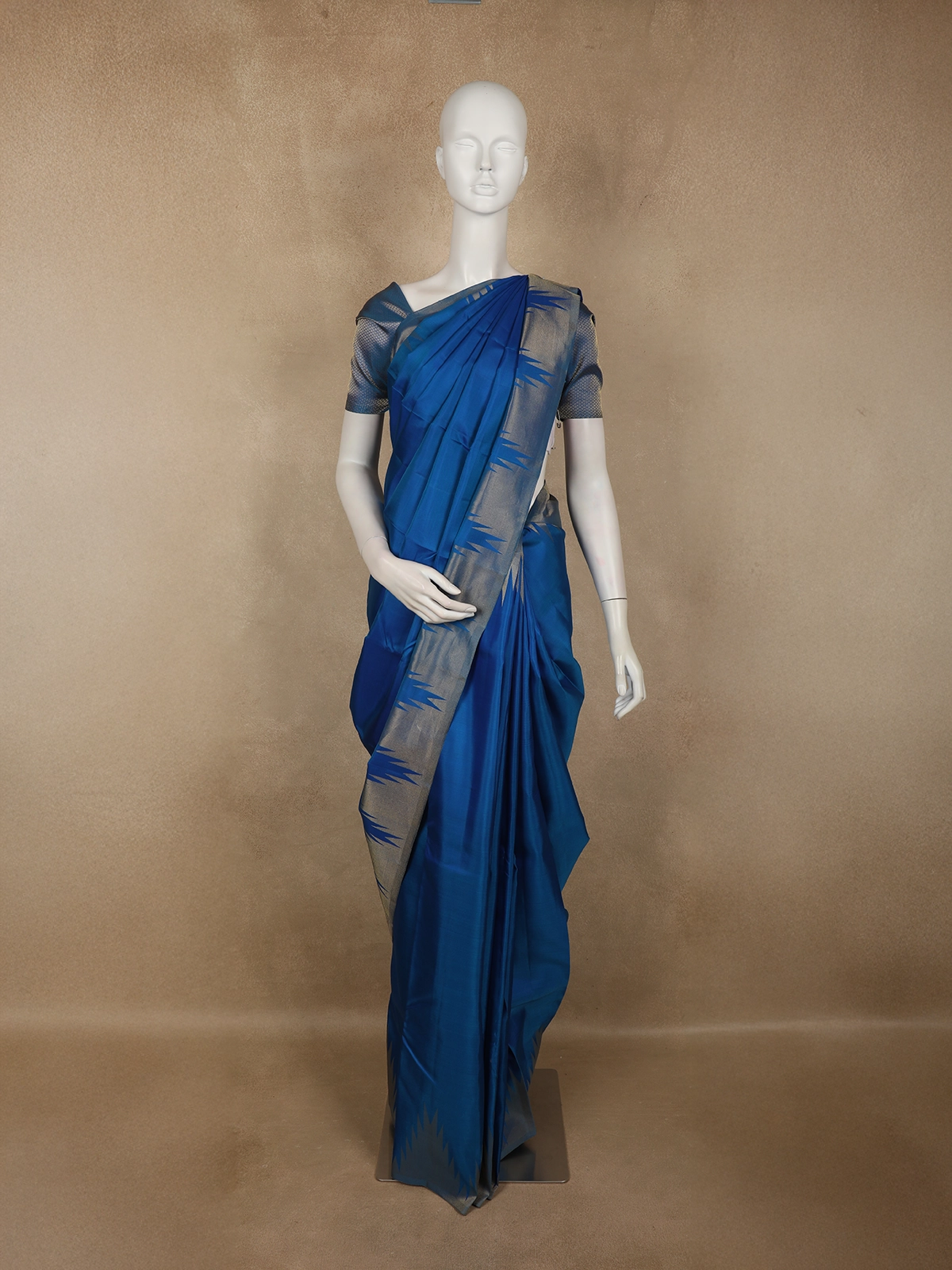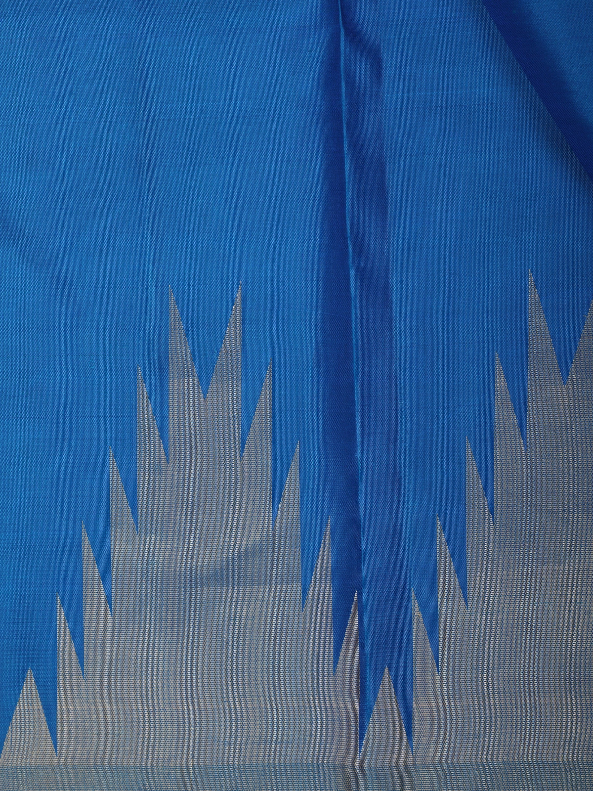 Enhancing its traditional appeal, the saree is finished with a classic temple-inspired border in a contrasting soft metallic grey tone, adorned with neatly woven zigzag temple motifs. The border adds a heritage touch while maintaining a subtle, contemporary balance against the bold blue body. The coordinated pallu continues the temple design, completing the saree with understated grandeur.