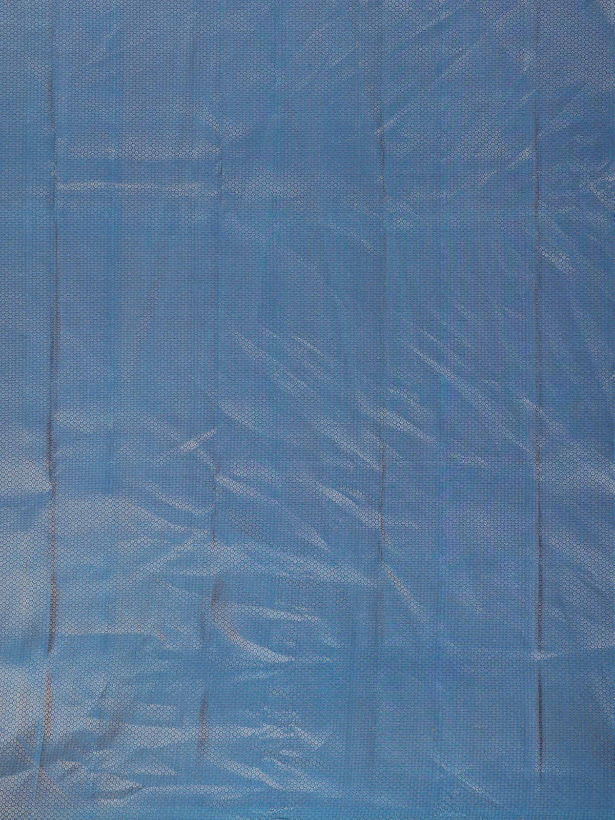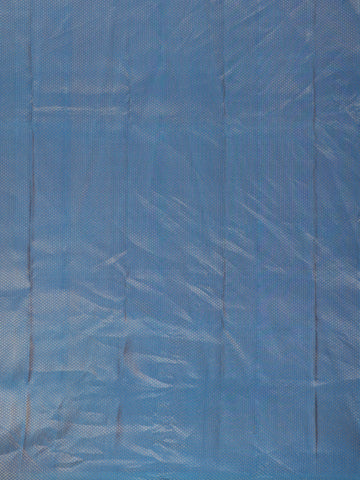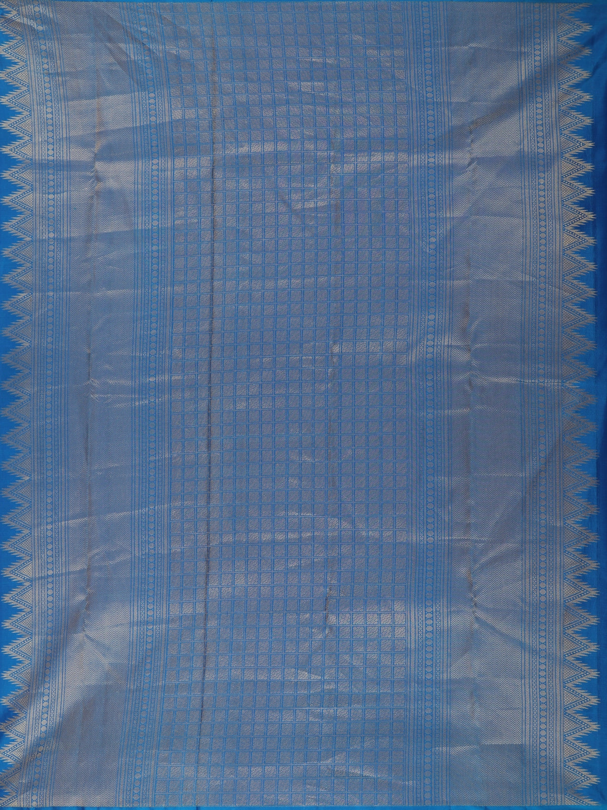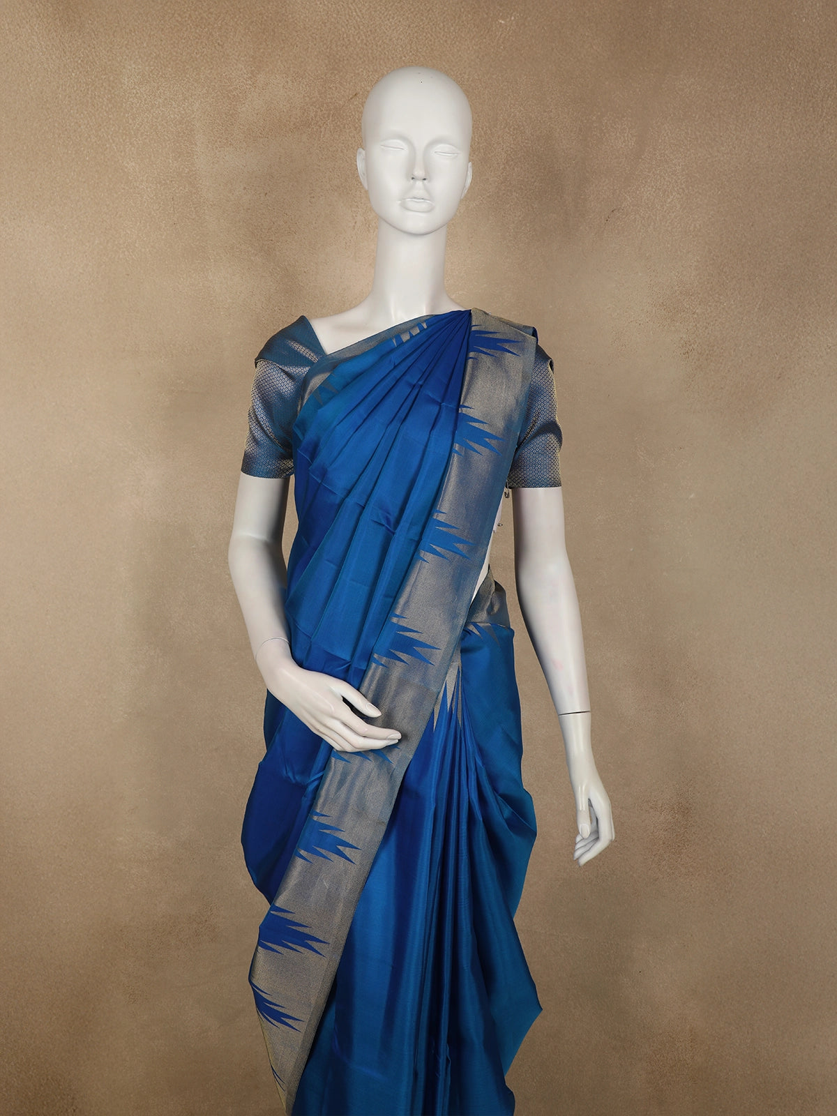 Enhancing its traditional appeal, the saree is finished with a classic temple-inspired border in a contrasting soft metallic grey tone, adorned with neatly woven zigzag temple motifs. The border adds a heritage touch while maintaining a subtle, contemporary balance against the bold blue body. The coordinated pallu continues the temple design, completing the saree with understated grandeur.