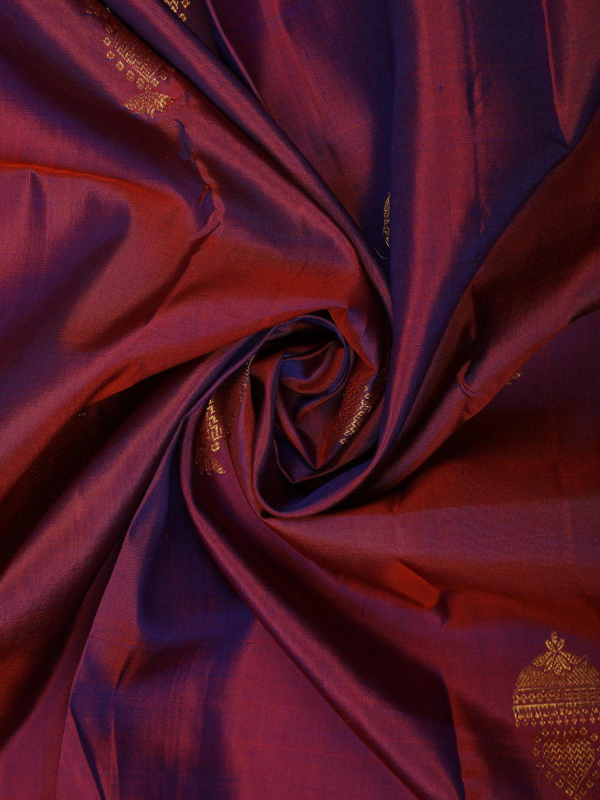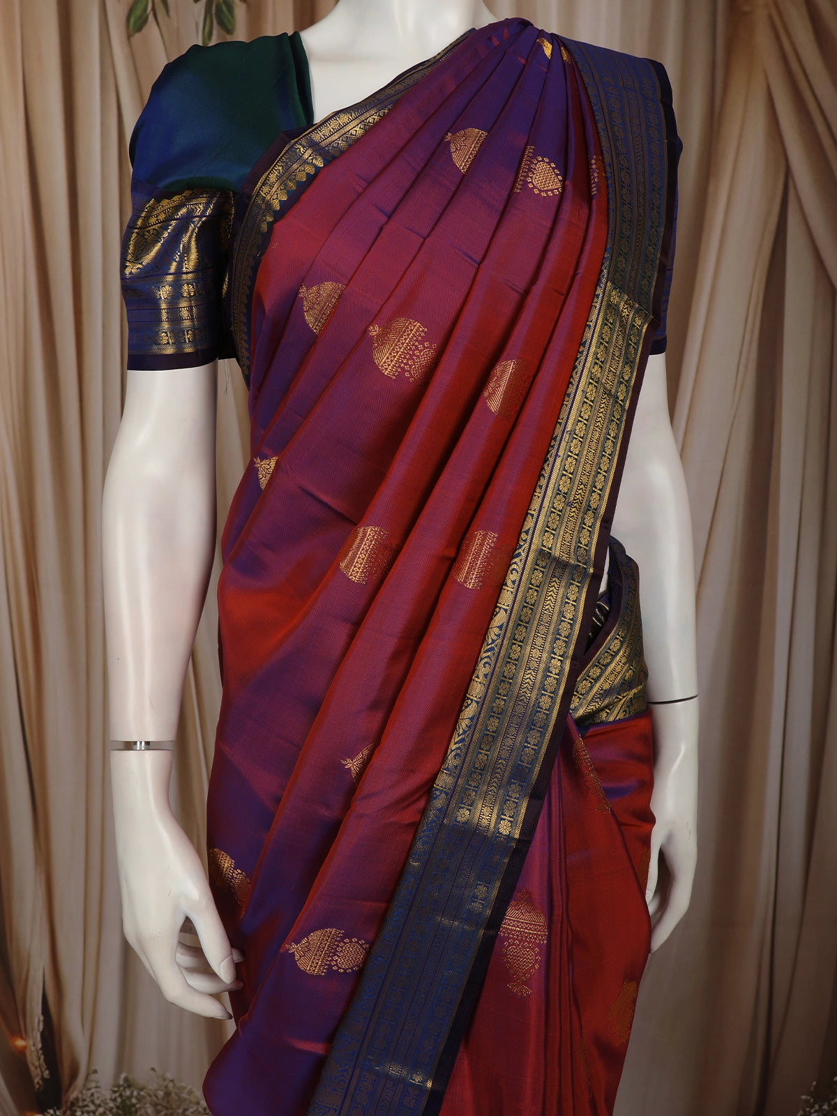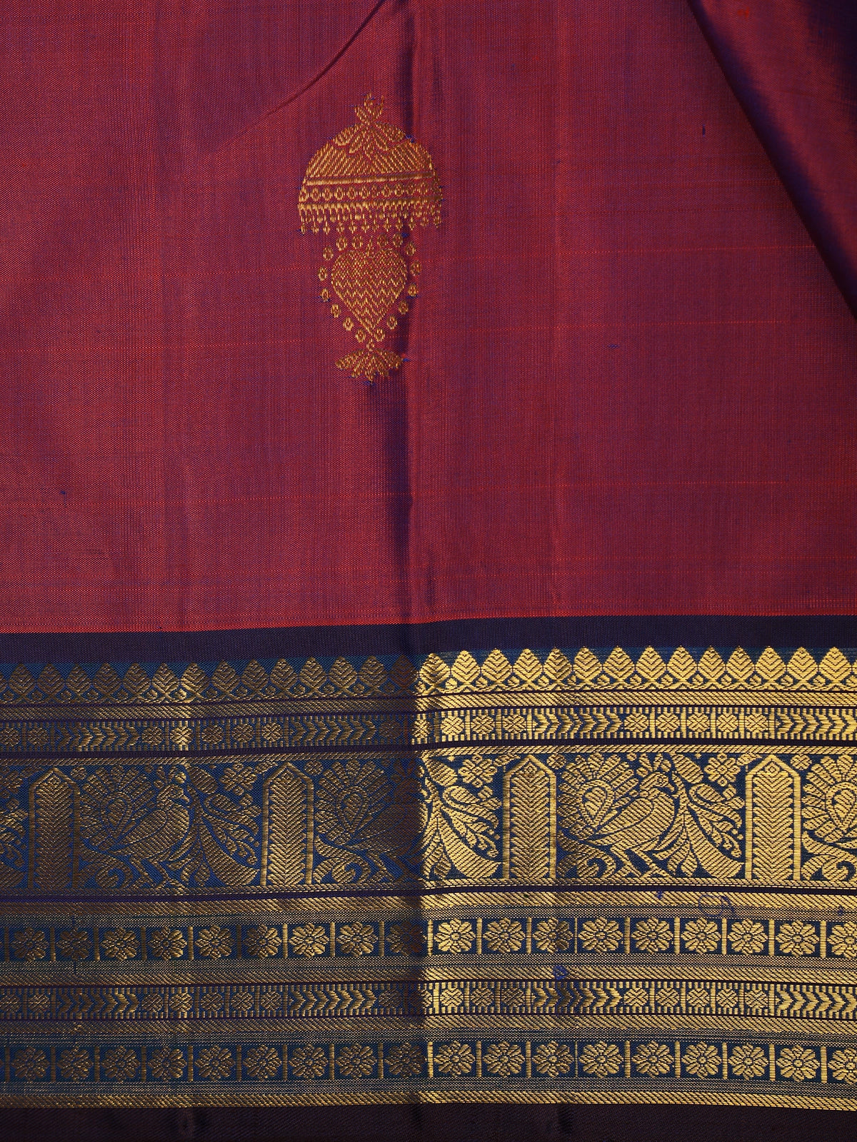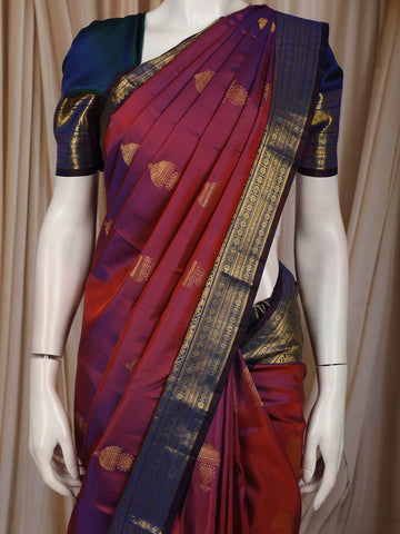 Royal Dual Tone Maroon Blue Butta Zari Woven Design Pure Kanchipuram Silk Saree with Contrast Border