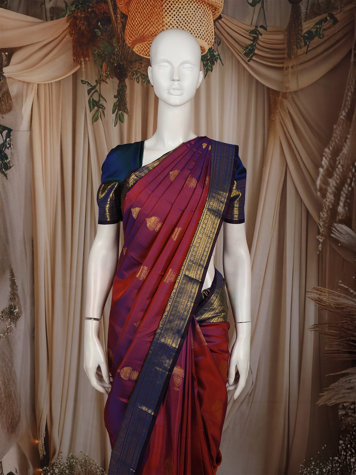 Celebrate timeless tradition with this Royal Dual Tone Maroon & Navy Blue Zari Woven Silk Saree with Contrast Border, designed to reflect elegance and heritage craftsmanship. Crafted from a premium silk blend fabric, this saree features a stunning dual-tone effect that shifts beautifully between rich maroon and deep navy blue hues, adding depth and visual richness.