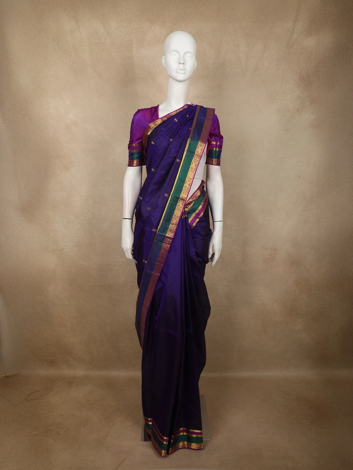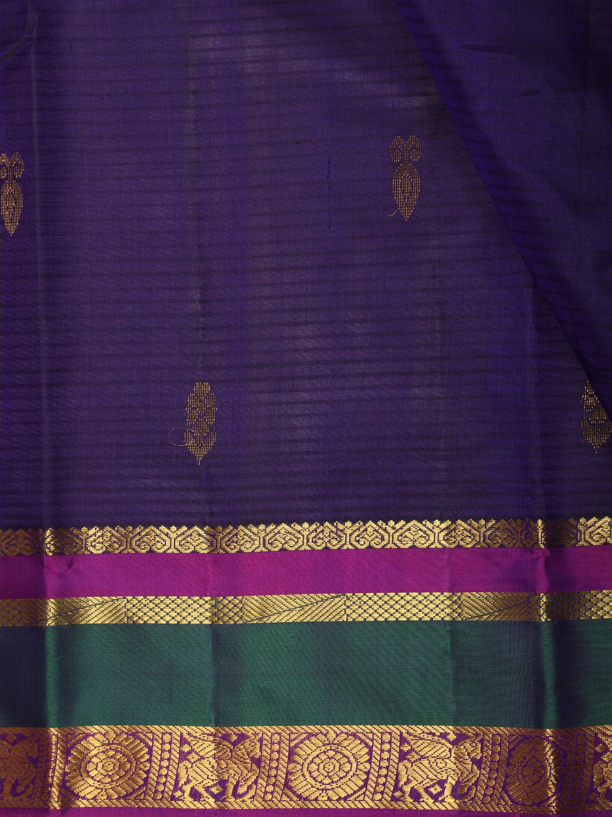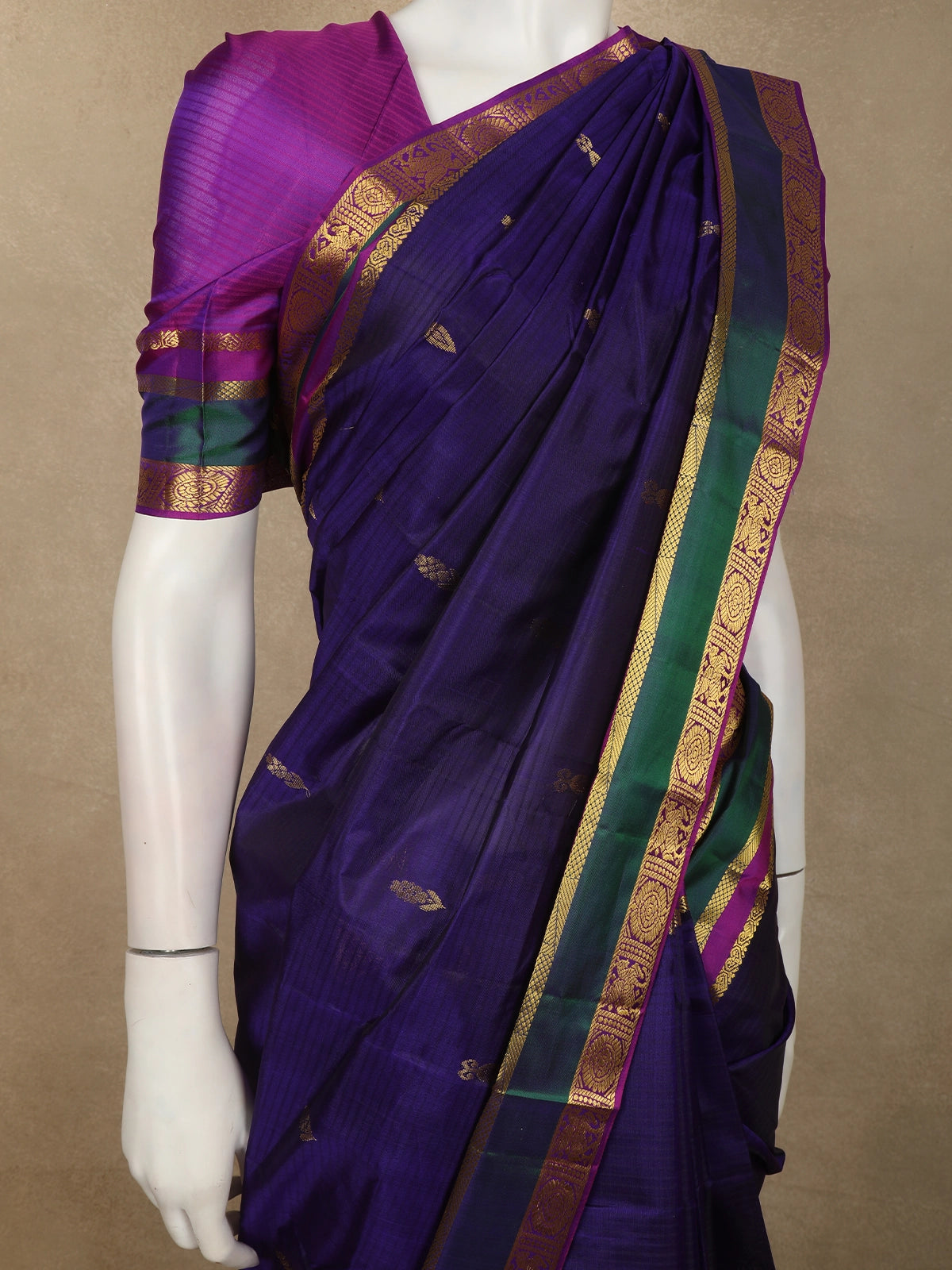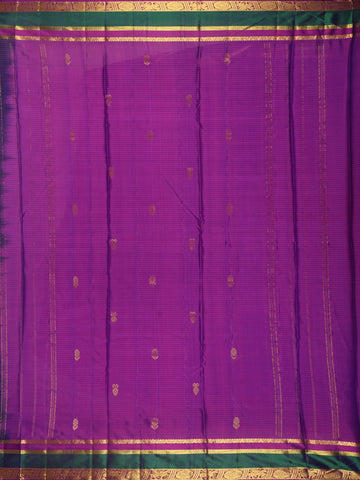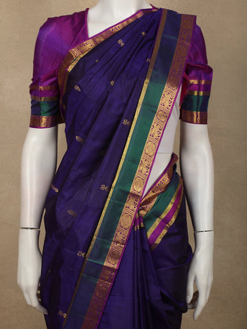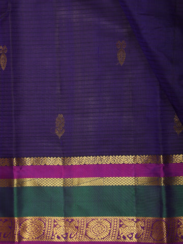 Enhancing the overall look is a beautifully crafted contrast zari border featuring rich gold zari weaving along with accents of deep emerald green and magenta. The combination of these traditional colors creates a striking yet harmonious contrast against the navy body, highlighting the artistry and signature style of classic Kanchipuram weaving. The ornamental border detailing adds depth and heritage character to the saree.