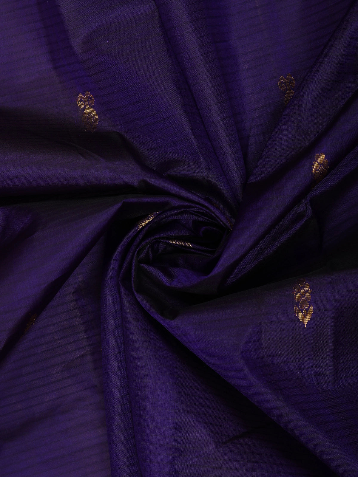 The body of the saree is adorned with delicate floral butta zari woven motifs that are thoughtfully scattered throughout the silk. These small gold zari buttas add a subtle sparkle and refined texture, enhancing the richness of the navy base while maintaining an elegant and understated charm.