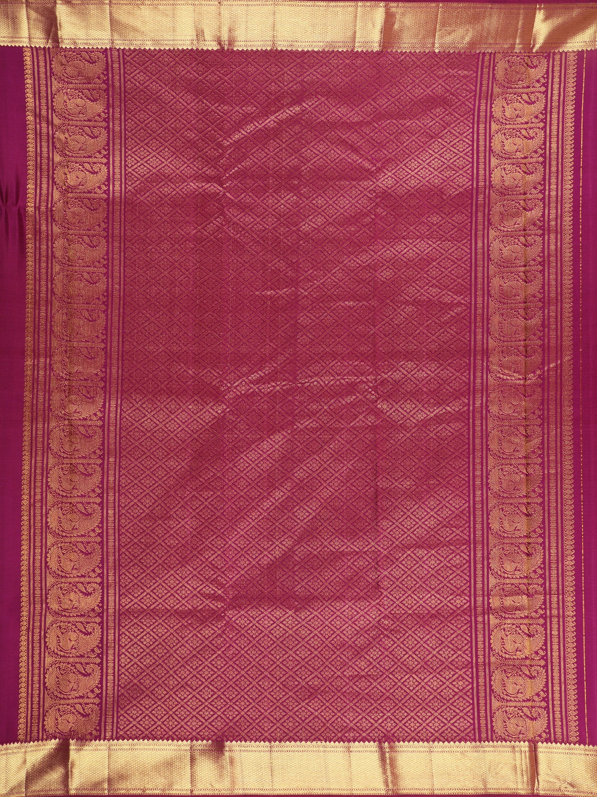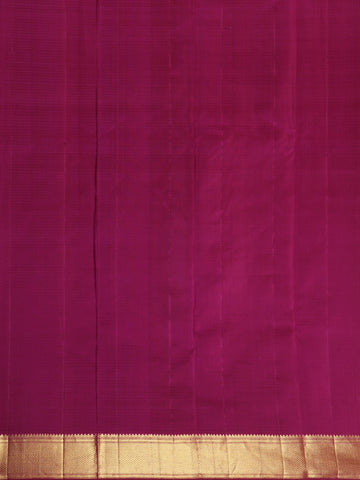 Exude royal elegance with this Royal Purple Checked and Peacock Woven Design Pure Kanchipuram Silk Saree, a magnificent blend of tradition and opulence. The deep royal purple hue forms a striking base, enhanced with an all-over fine gold zari checked pattern that lends structure, depth, and a subtle luminous sheen to the body of the saree.