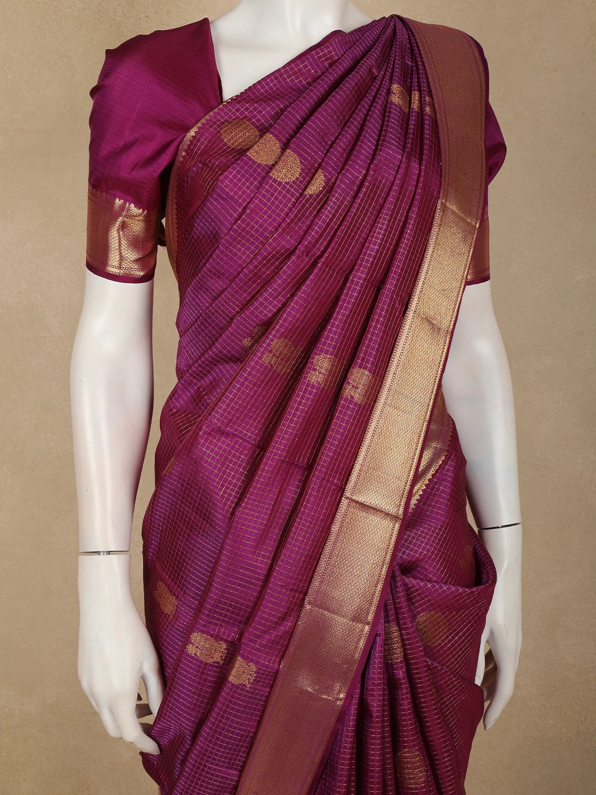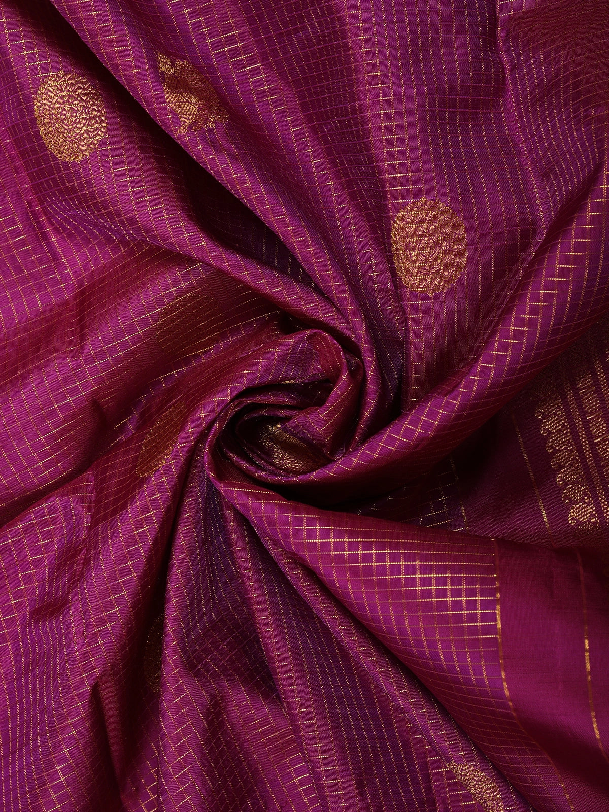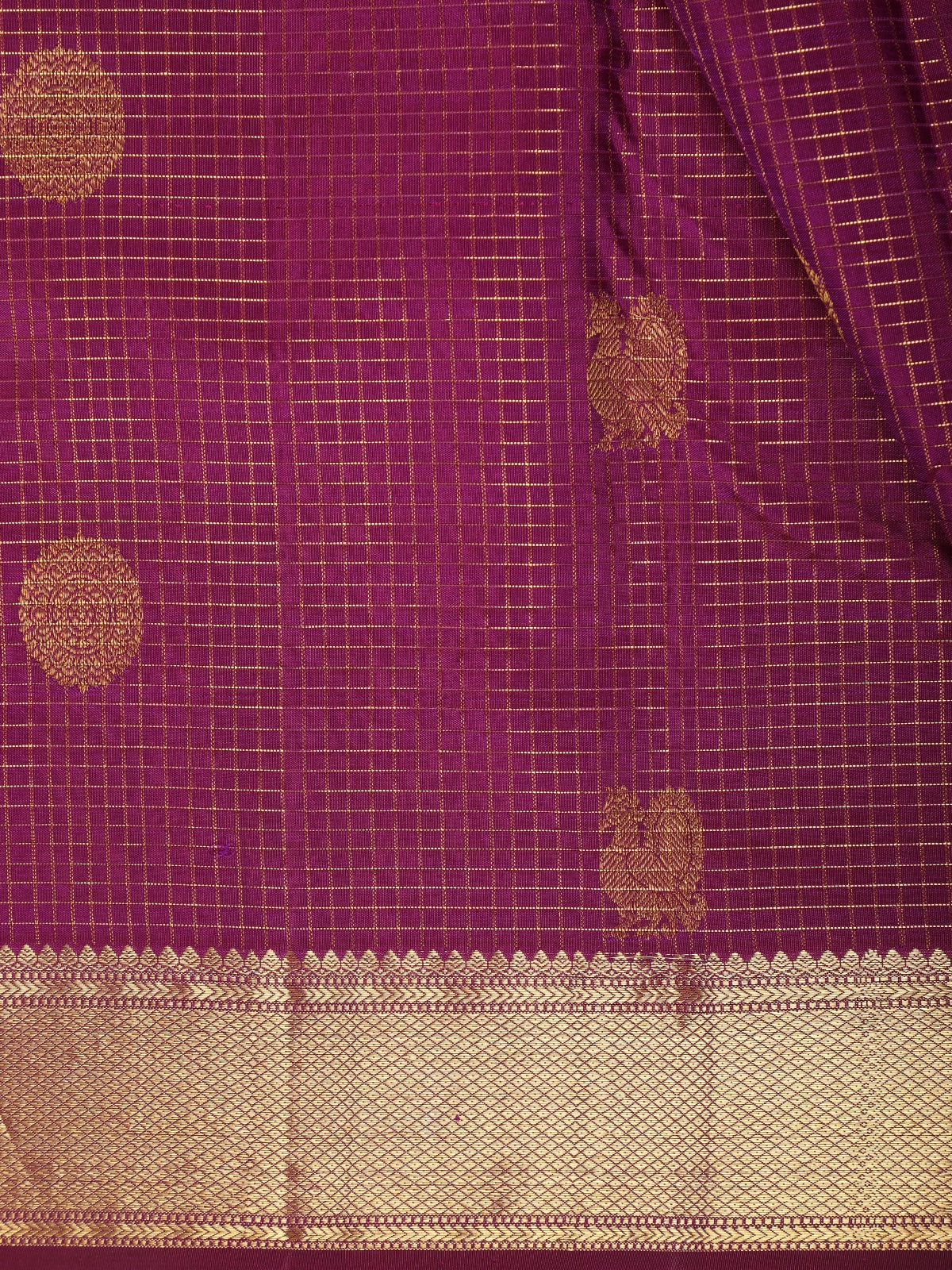 Royal Purple Checked and Peacock Woven Design Pure Kanchipuram Silk Saree with Gold Zari Border