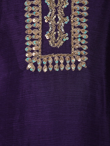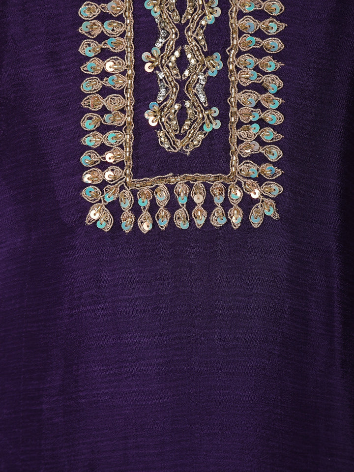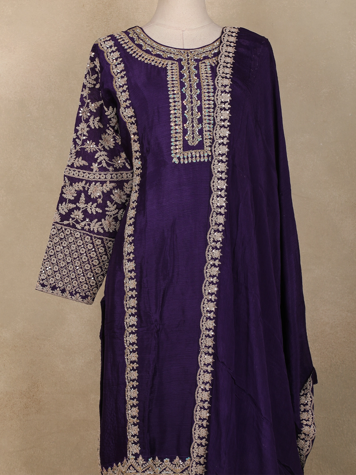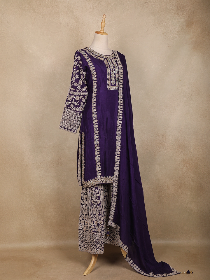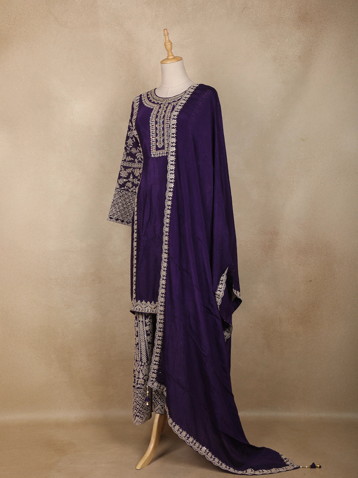 Step into elegance with this regal palazzo suit crafted in a rich royal purple Crepe silk fabric. The outfit features exquisite floral thread embroidery highlighted with shimmering sequins, adding a luxurious festive charm. The beautifully embellished round neckline and full sleeves enhance its traditional grandeur, while the matching dupatta with intricate borders completes the ensemble with graceful finesse.